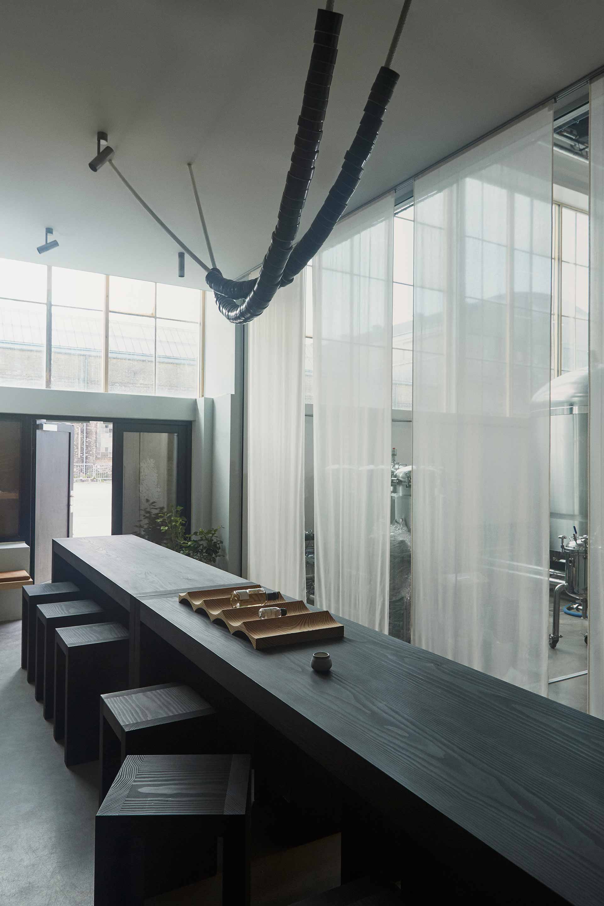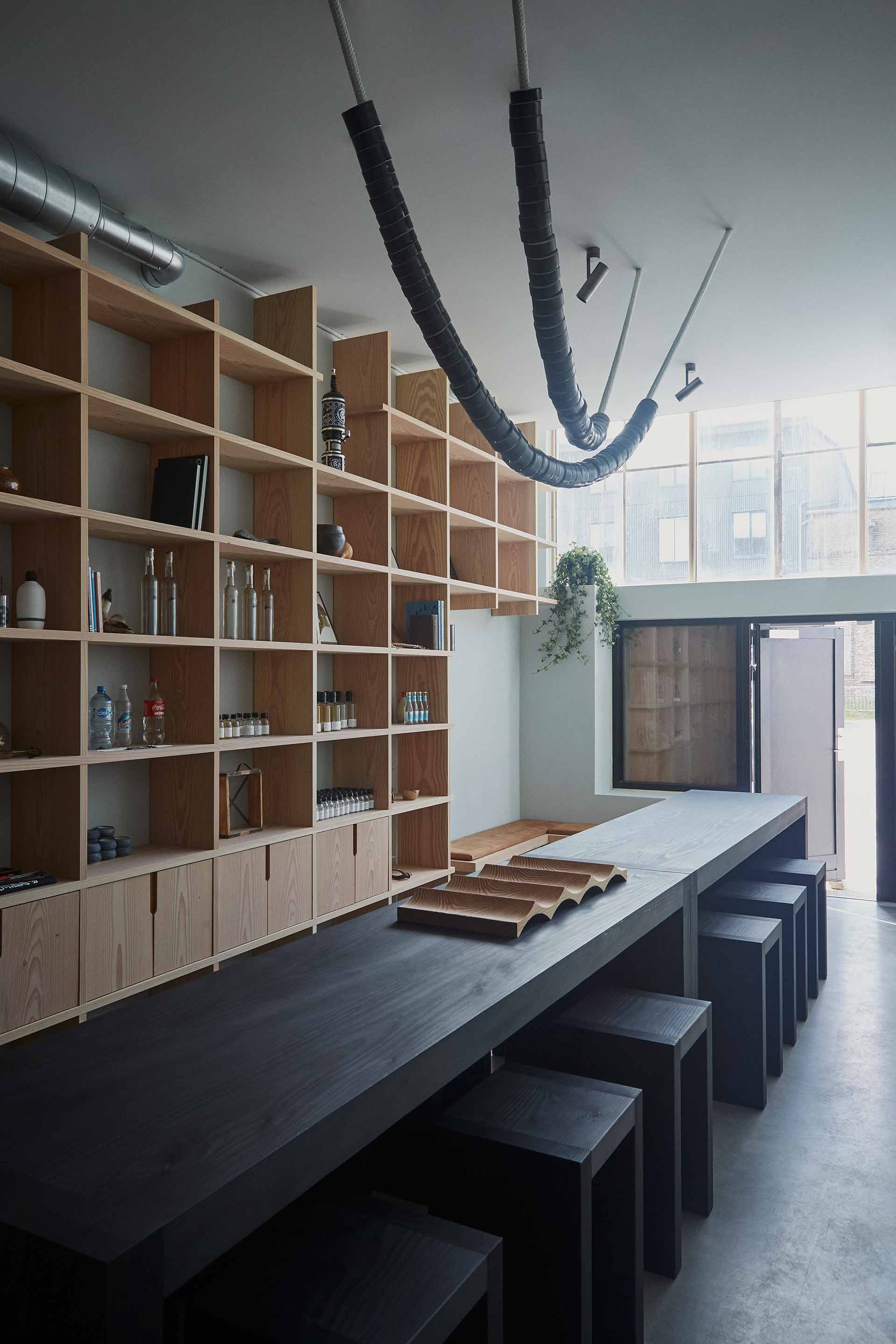 Like an ever-changing cabinet of curiosities, from where visitors can observe the buzzing life from the distillery, Studio Pneuma and Design Studies have created the impressive tasting room of Copenhagen distillery, Empirical Spirits. Bespoke furniture in solid Douglas adds to the experience.