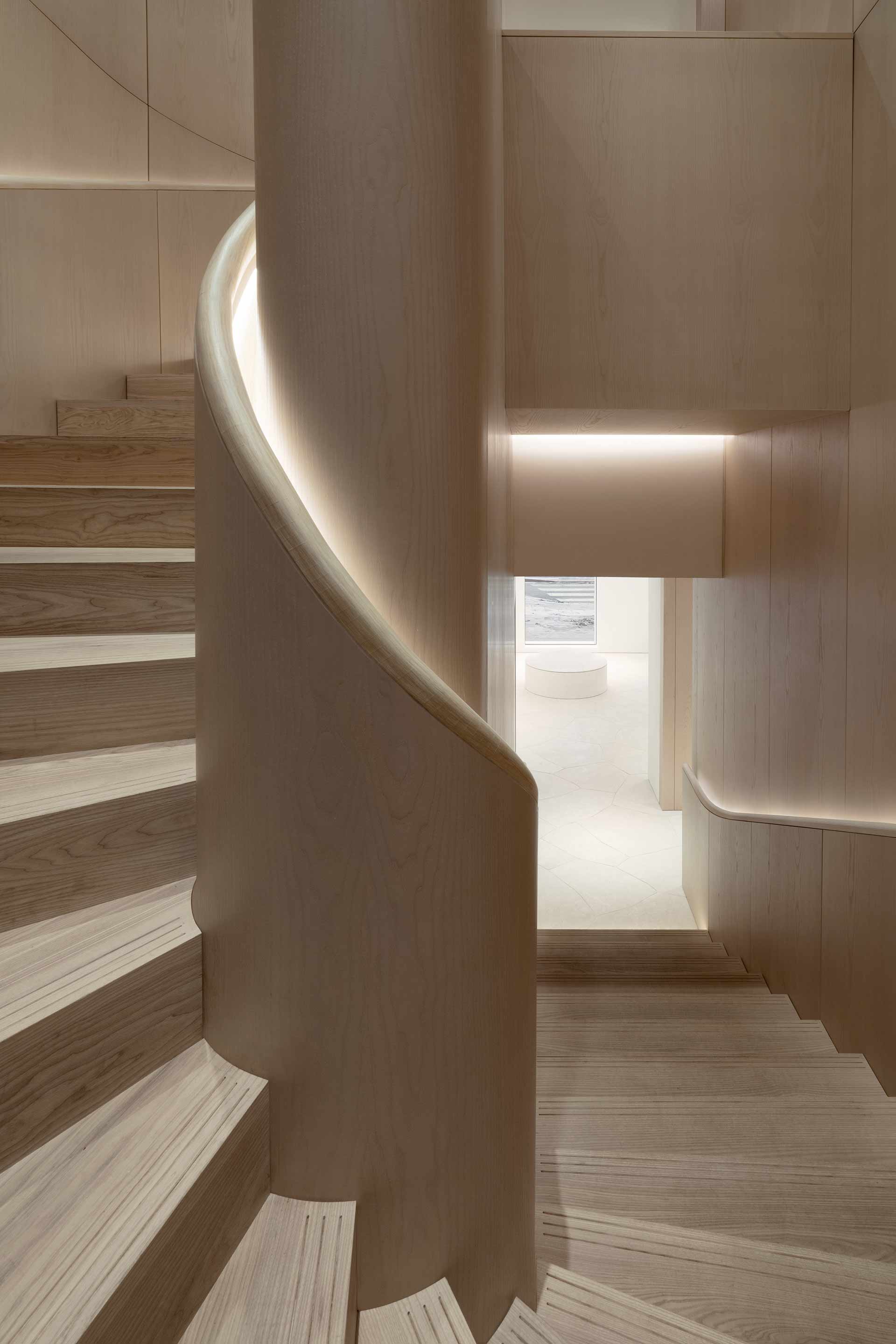 For Jil Sander’s flagship store in Paris, John Pawson gently transformed a historically listed building alongside the brand’s creative directors Lucie and Luke Meier. Its warm, grand atmosphere captures his characteristically intimate reading of the site, a quiet yet distinct presence in the final space. Chevron flooring and sculptural staircase in Dinesen Ash ties the different rooms together, creating a focused atmosphere that heightens the senses.