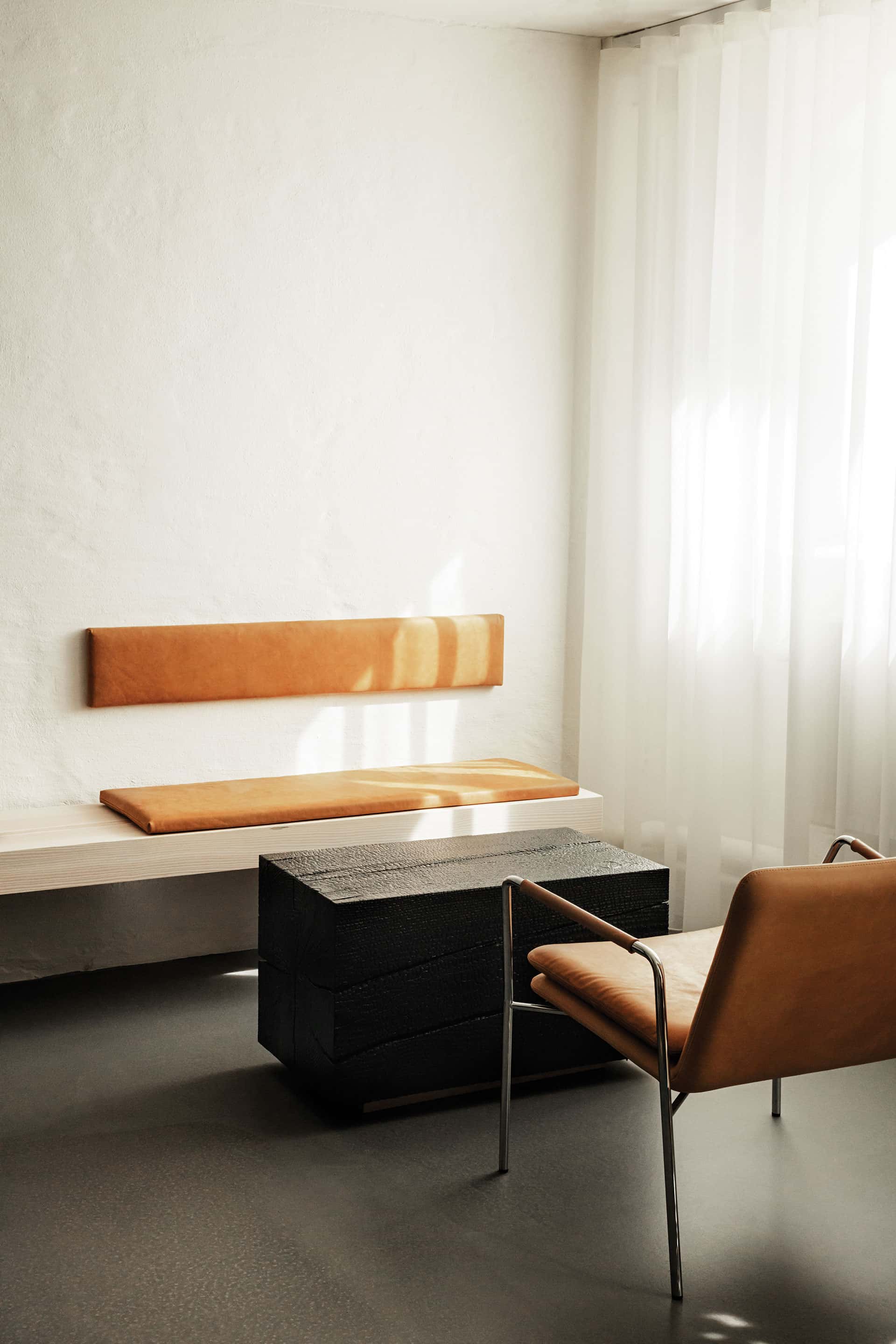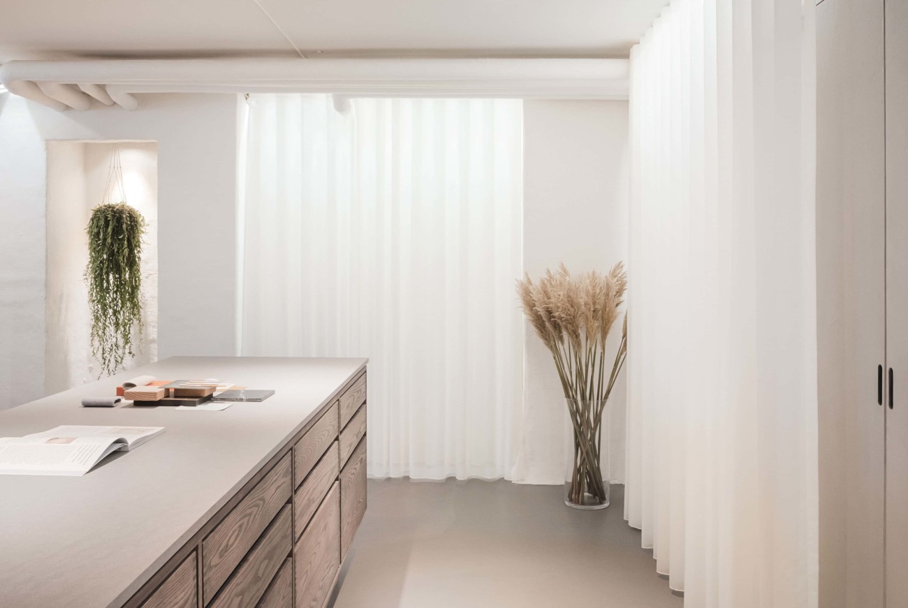 The entire Mejlborg showroom is styled like a home, creating a calming and inviting atmosphere for visitors to immerse themselves into a joint Dinesen and Garde Hvalsøe universe, visualising their projects.
