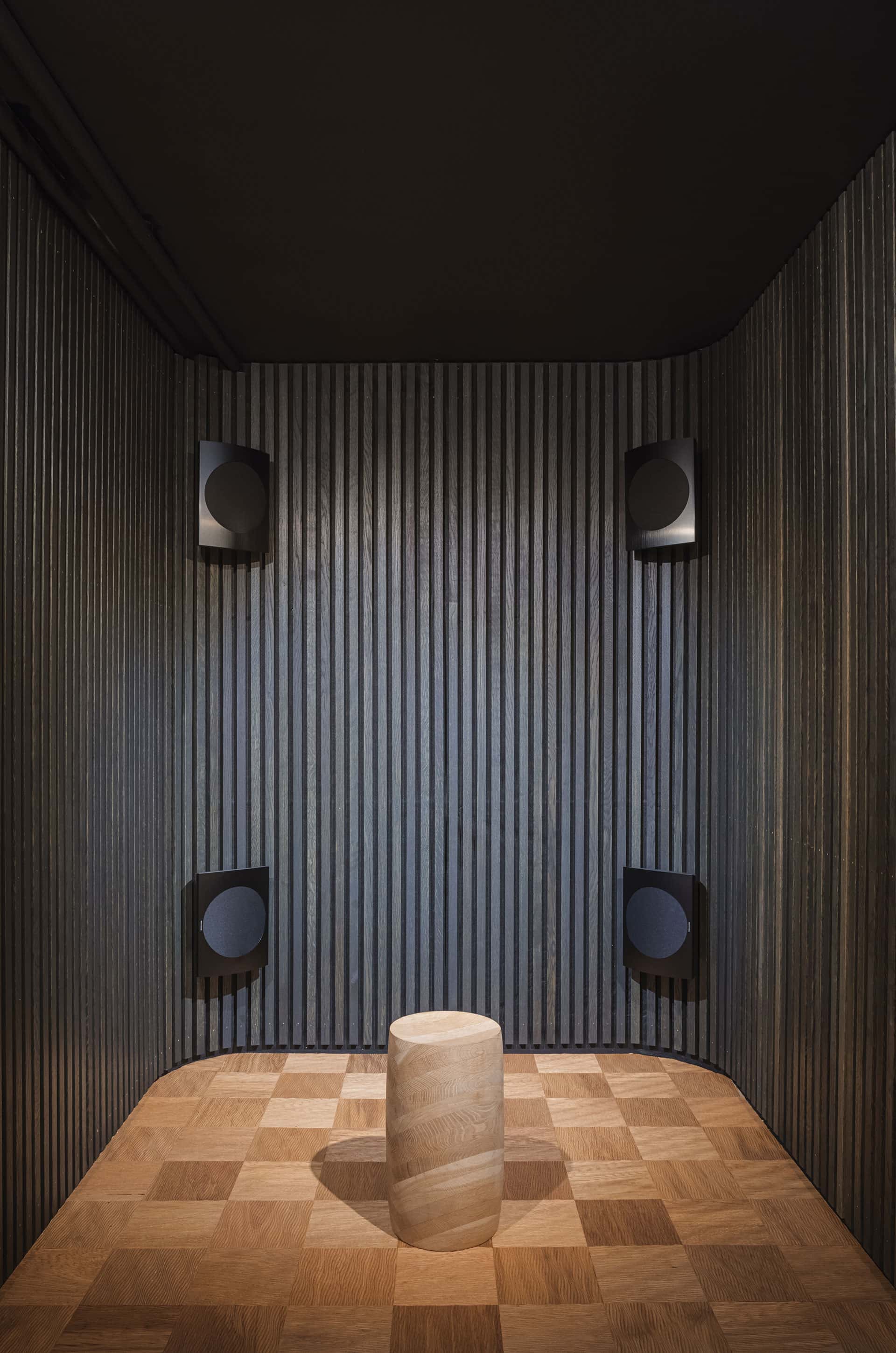 Besides the facilities that invite to be used for exhibitions, workshops, talks and meetings, the basement also contains a special room dedicated to exploring the invisible qualities of materials through sound. Here, we encourage visitors to step in barefoot, close the door and turn off the light to experience a six-minute meditative soundtrack of a 100-year-old Douglas tree being cut down with chainsaws in the Black Forest.