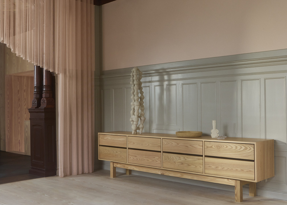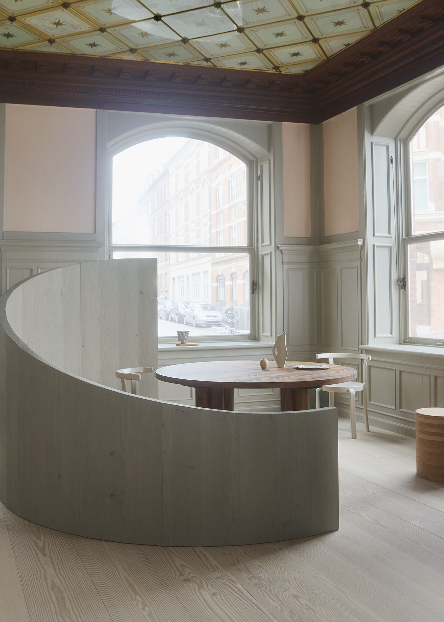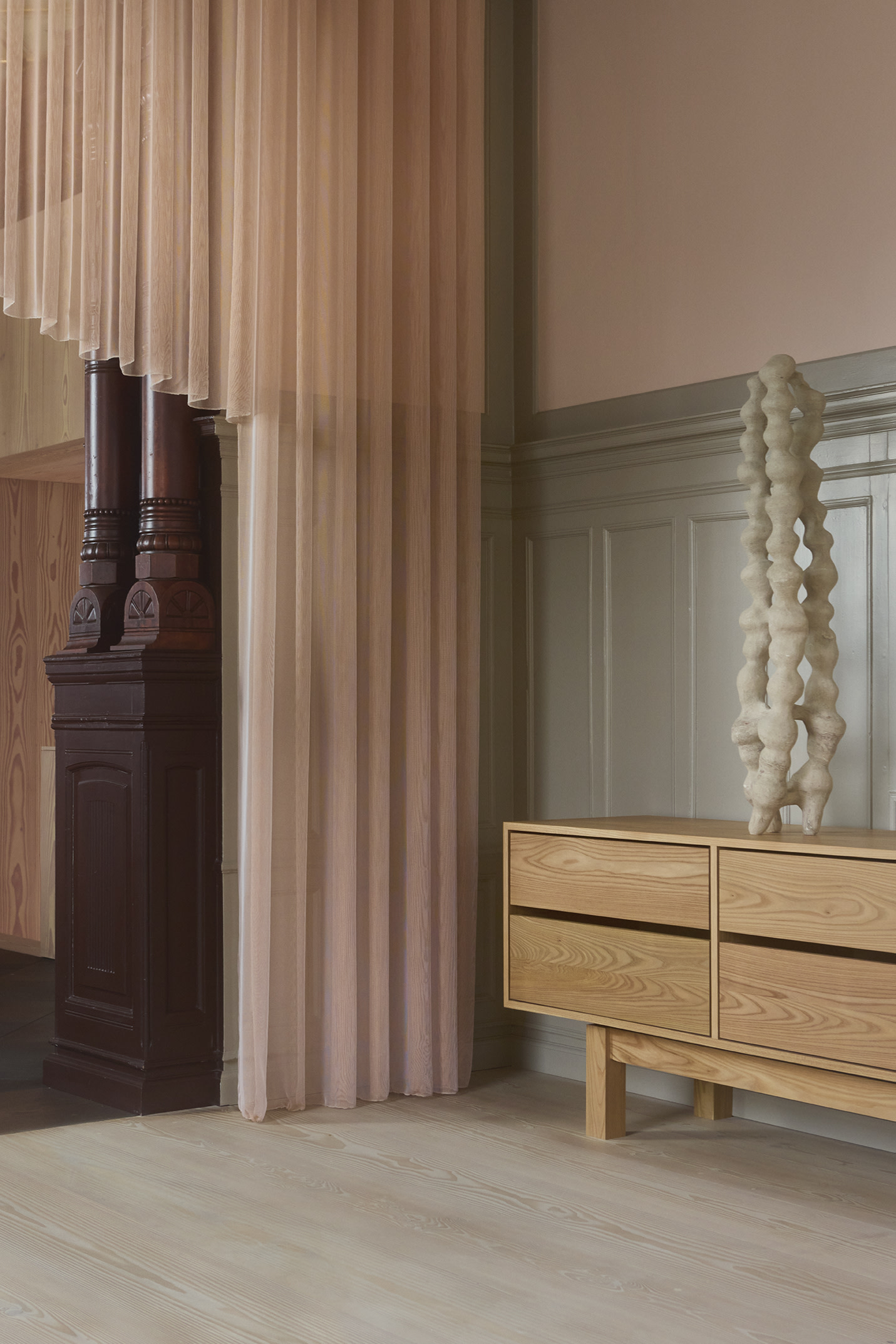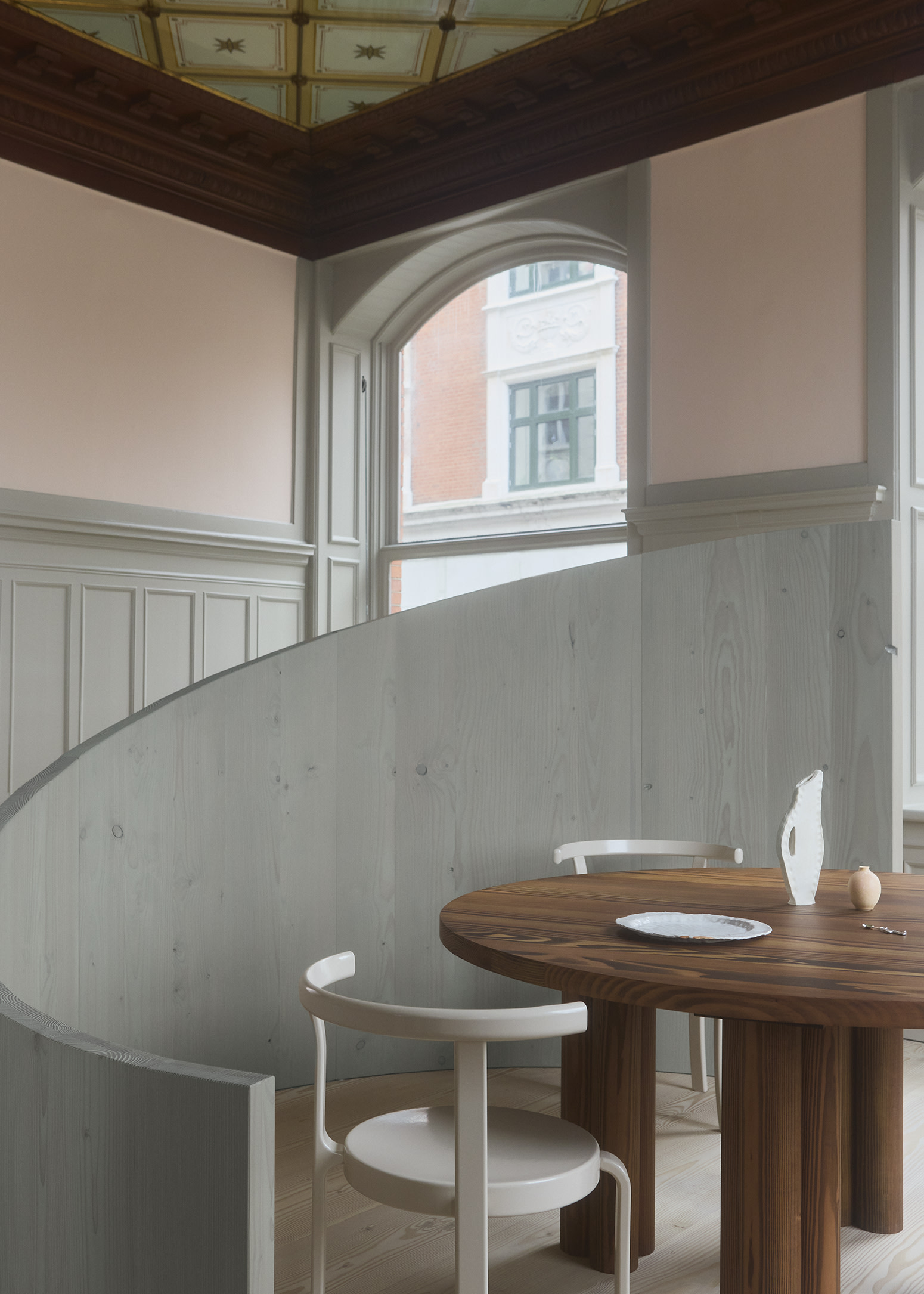 The first room to enter is the Salon, which, with its asymmetric spatial room divider, provides a perfect setting for people to gather as a cosy meeting area. The bespoke curved room divider is made of Dinesen Douglas and finished with Ash Oil, which perfectly contrasts the light pink curtains and walls.