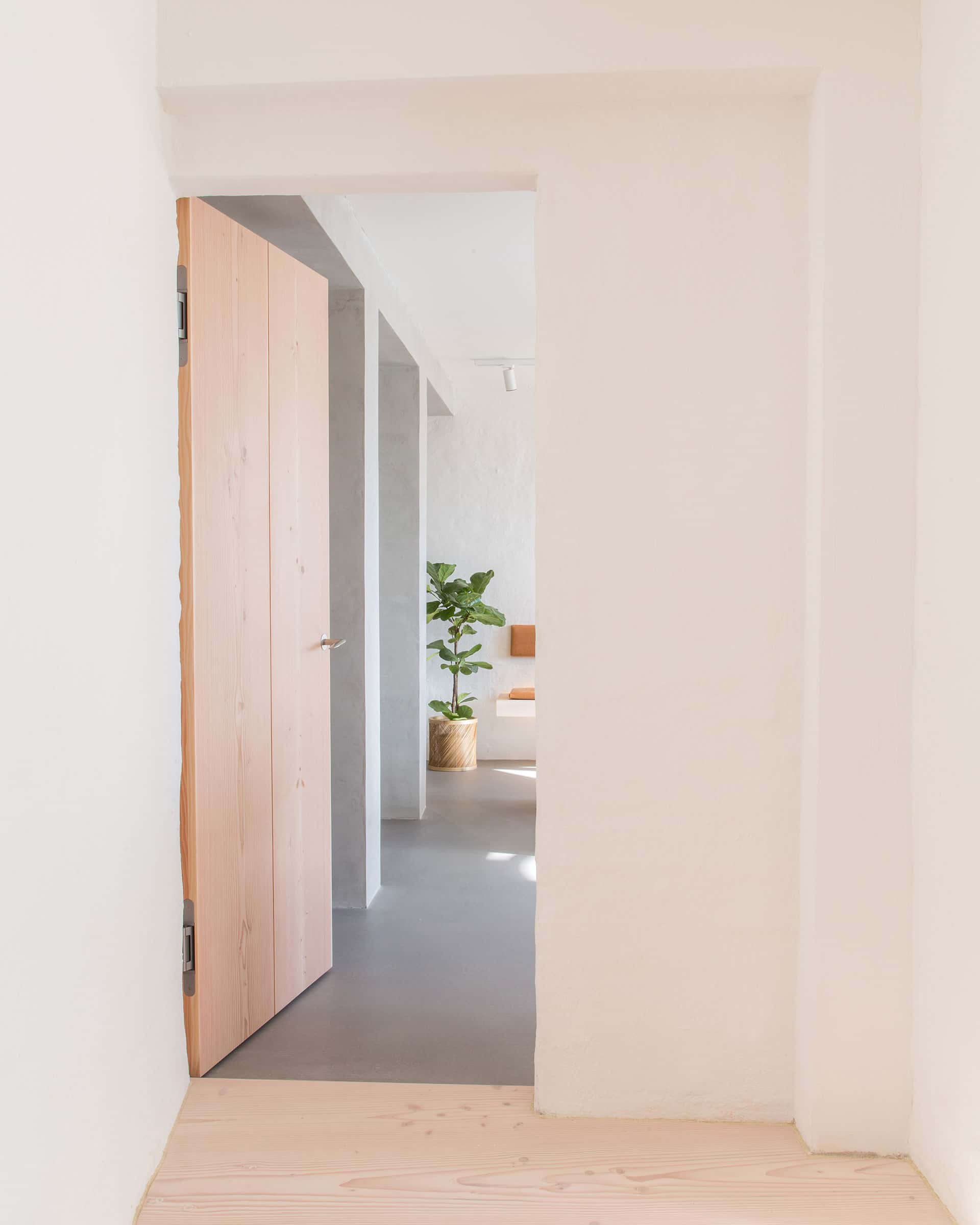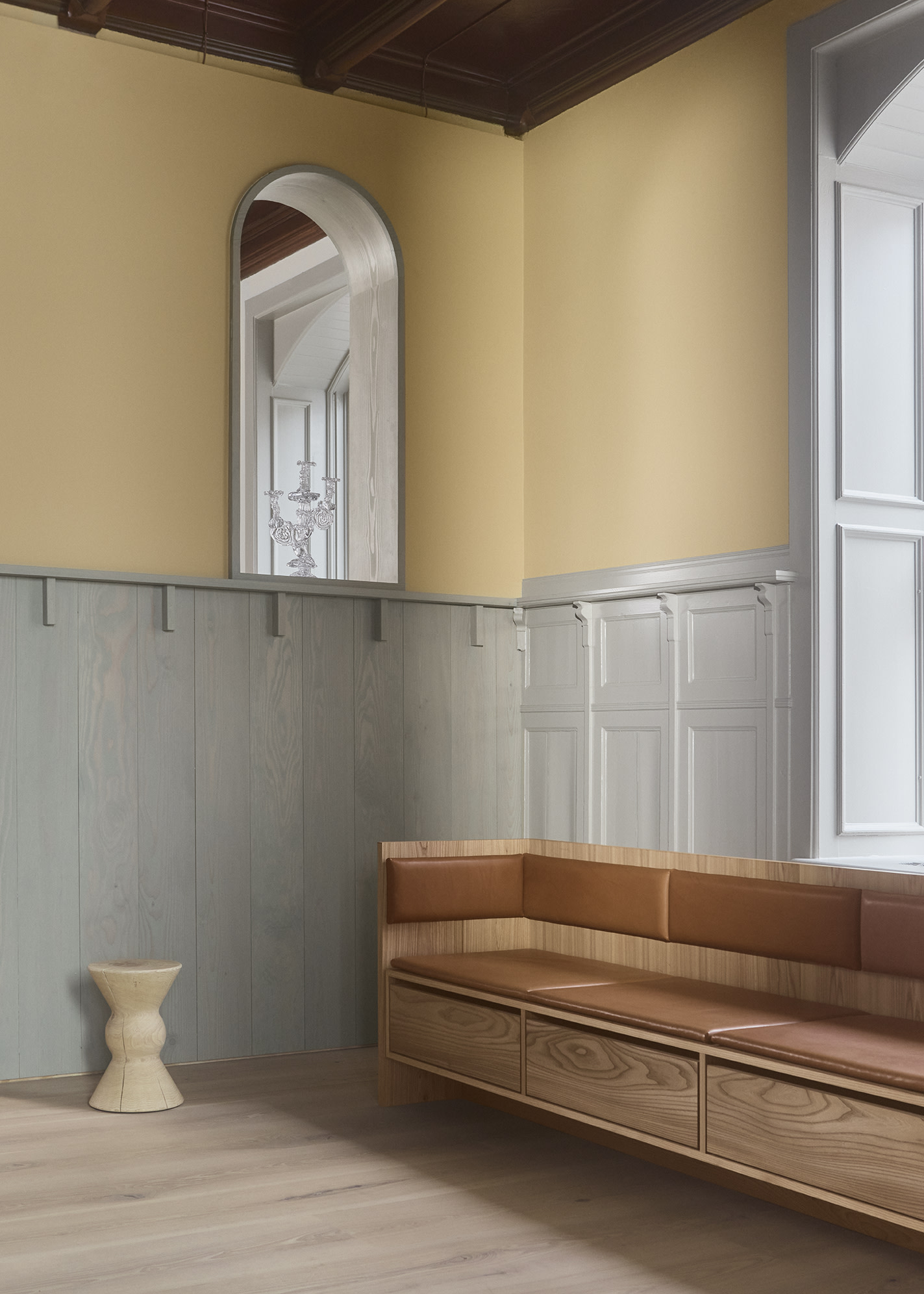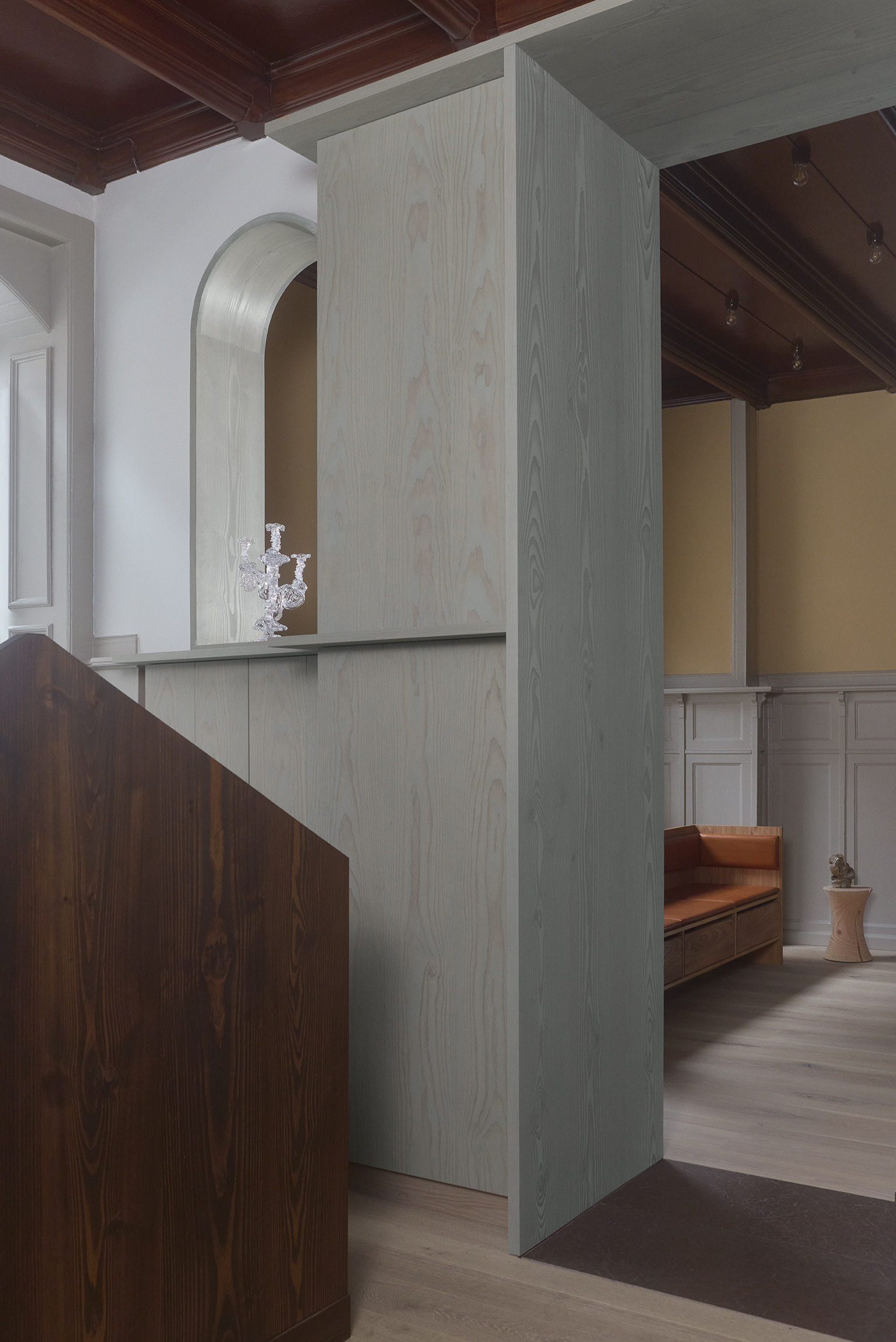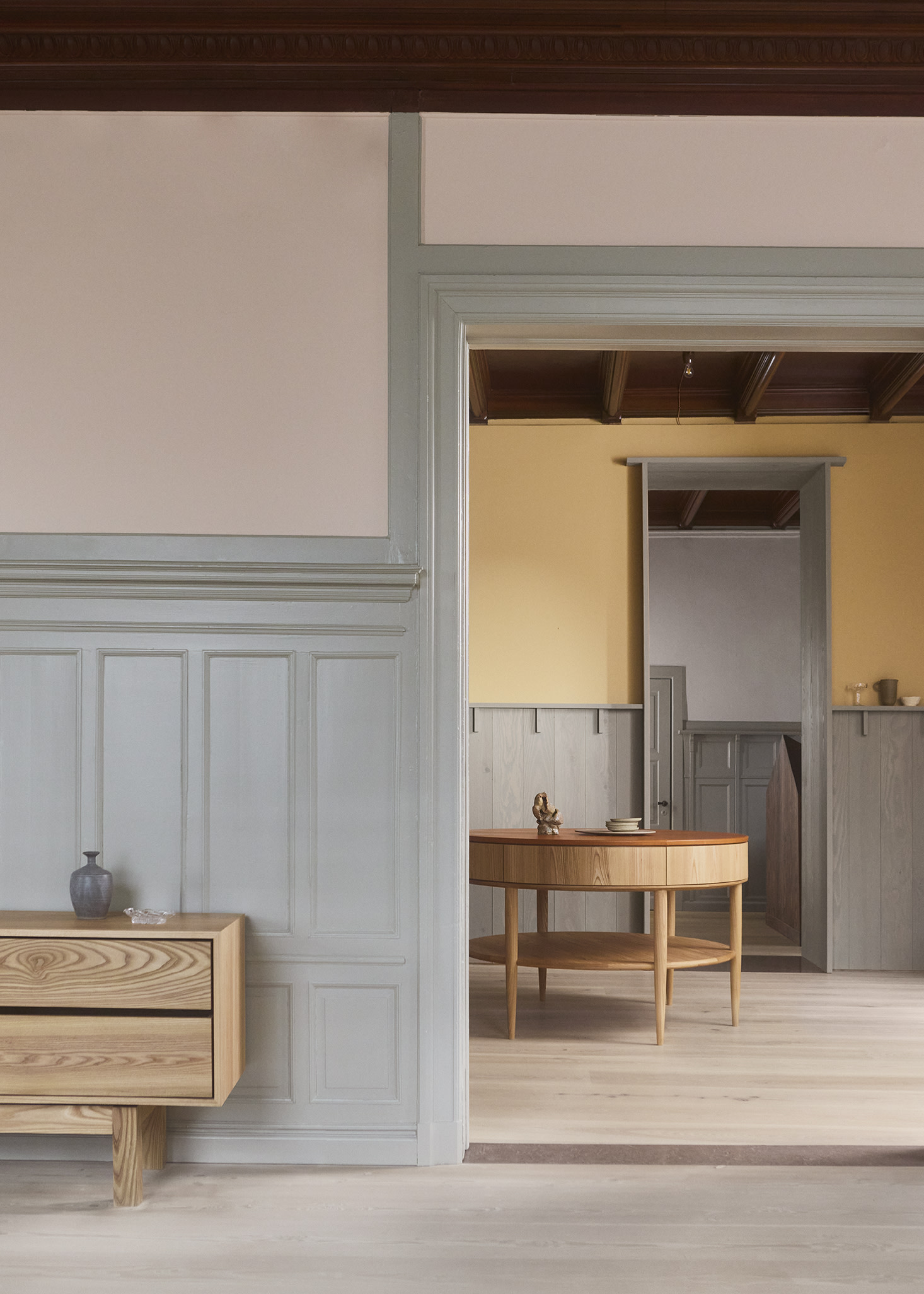 The first room to enter is the Salon, which, with its asymmetric spatial room divider, provides a perfect setting for people to gather as a cosy meeting area. The bespoke curved room divider is made of Dinesen Douglas and finished with Ash Oil, which perfectly contrasts the light pink curtains and walls.