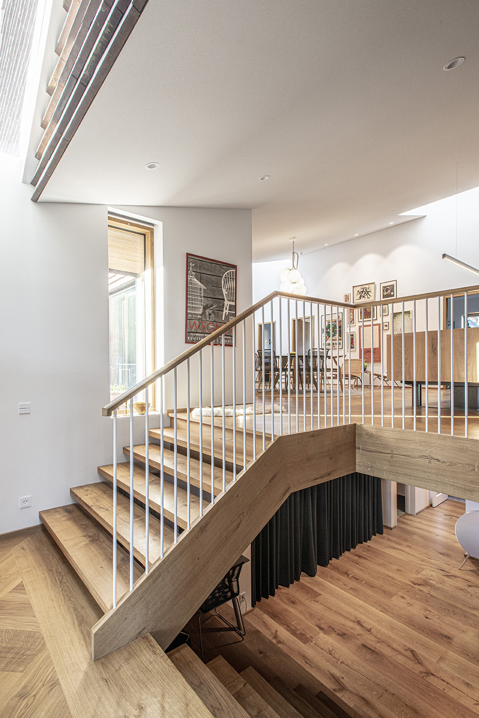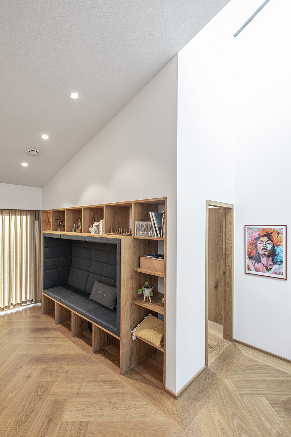 Dinesen oak floors are used throughout the interior, combined with bespoke solutions in Dinesen wood, including window sills, doors and panelled ceilings. The bedrooms have HeartOak floors, while the common areas feature Oak Herringbone. The floors are finished with Natural Oil, which brings out the natural colour variations of the wood. The wood brings a warm glow and atmosphere to the house.