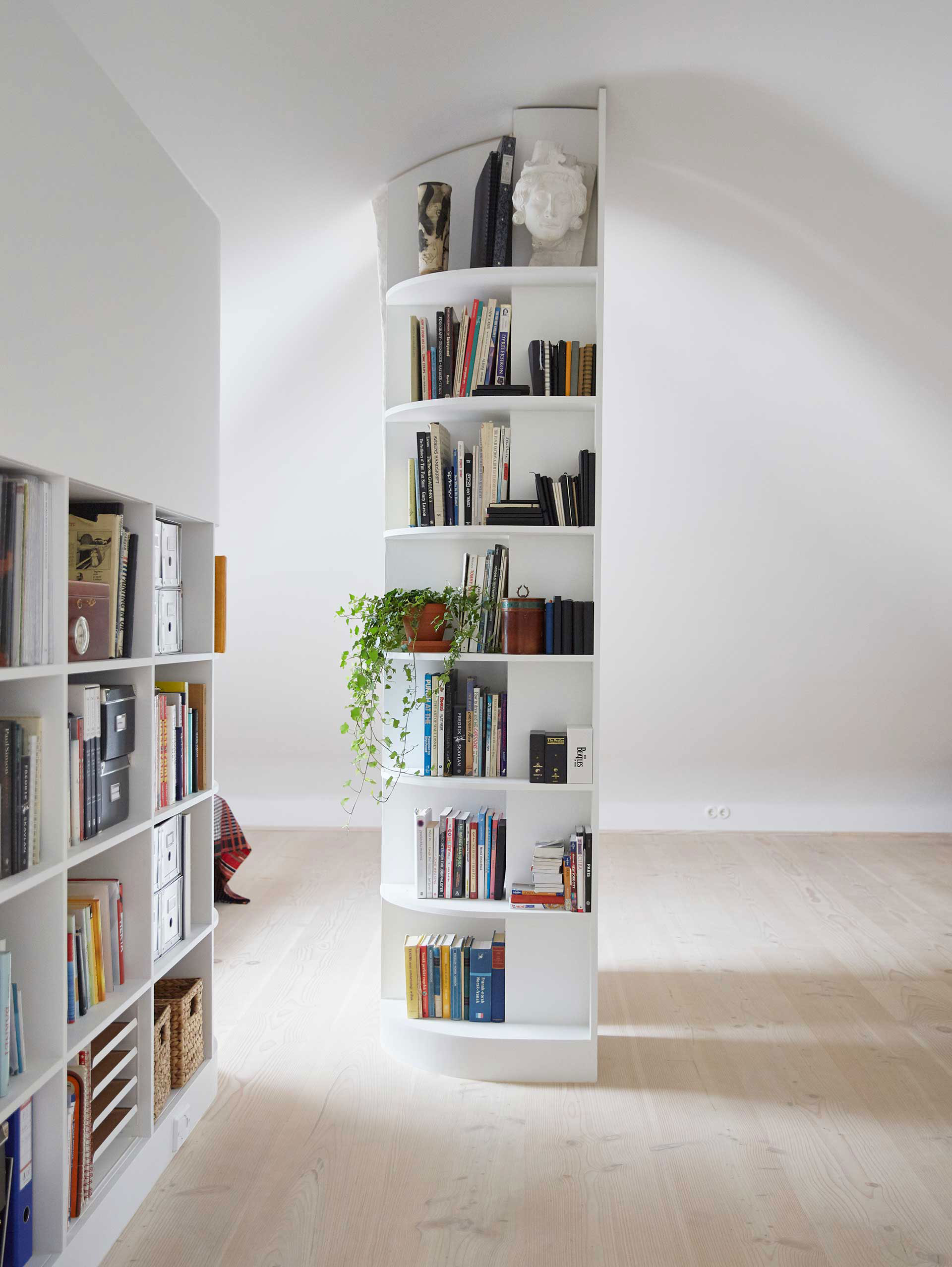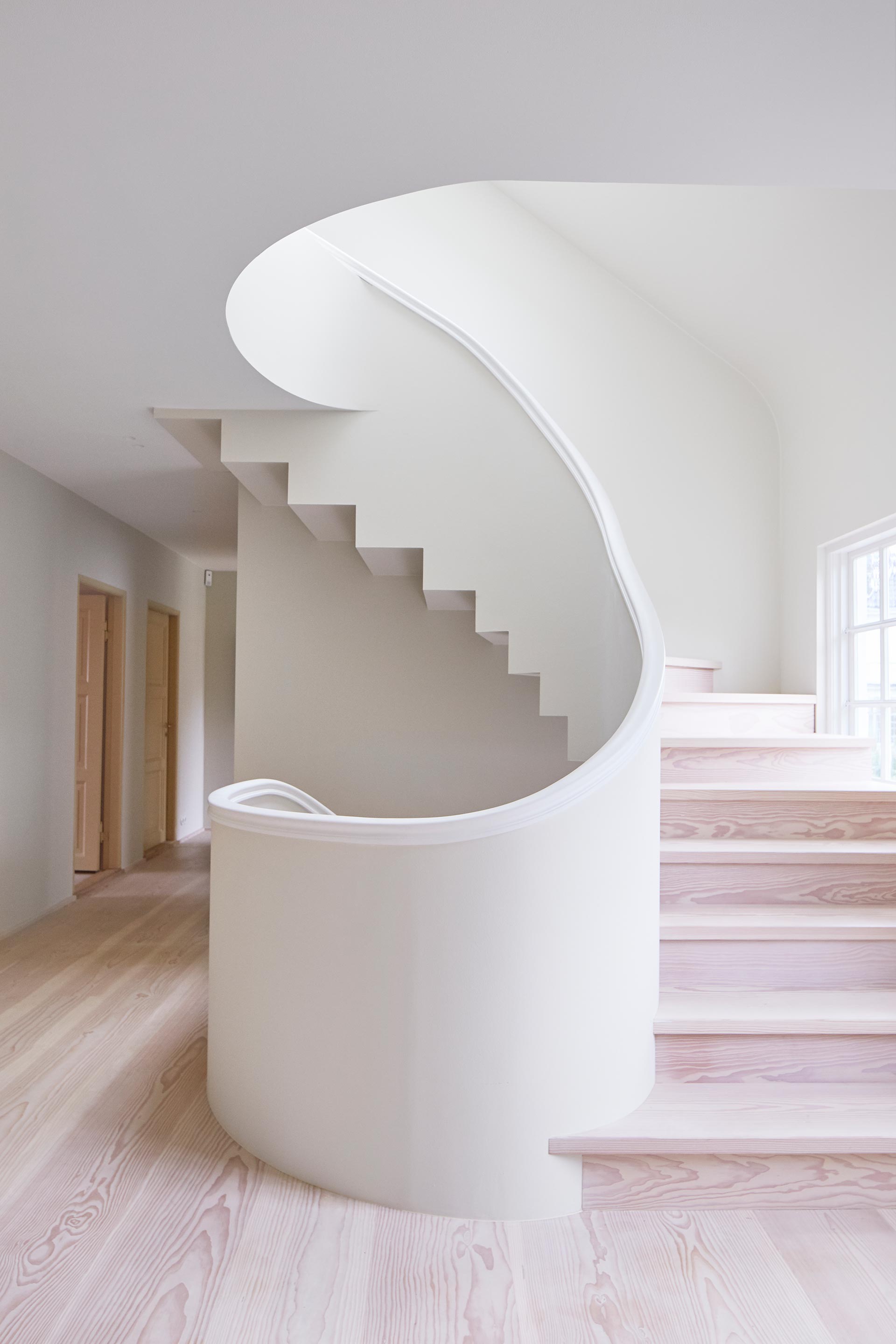 The Douglas planks continue in the magnificent staircase that connects the levels of the house, all the way from the basement to the attic. The staircase was designed in collaboration with Kitchen & Room, and with its beautiful curves and architectural lines it functions as a piece of art in itself.