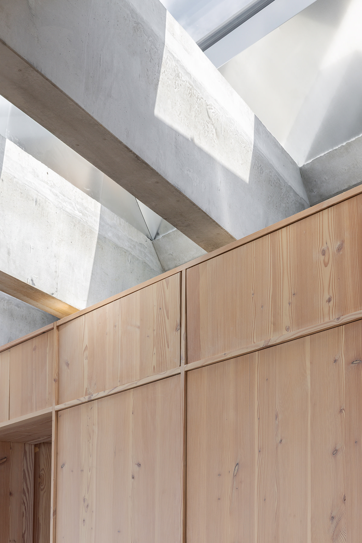 Dinesen tilfører varme og sanselighed med smukke Douglas trægulve og skræddersyet opbevaring på tværs af niveauerne, der balancerer rummenes rå strukturer og skaber en jordnær ro.