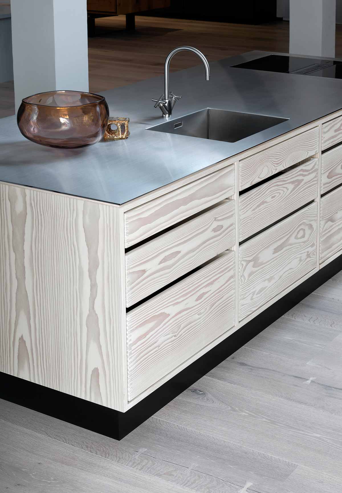 It is far from the first time that Dinesen and Garde Halvsøe’s handcrafts unite. After having designed many tailored kitchens for homes with Dinesen floors a thought arose in 2014. What if a kitchen was made which would be experienced as a natural extension of the wood floor? Letting Garde Hvalsøe’s handcraft and sense of quality meet Dinesen’s handcraft and quality wood. This spawn the kitchen model “Dinesen” that is one of Garde Hvalsøe’s most distinctive and iconic carpenter kitchens.