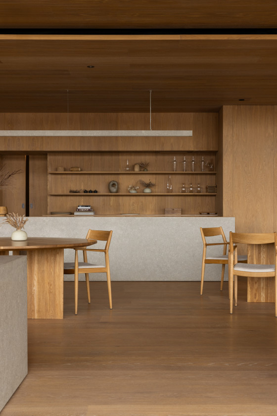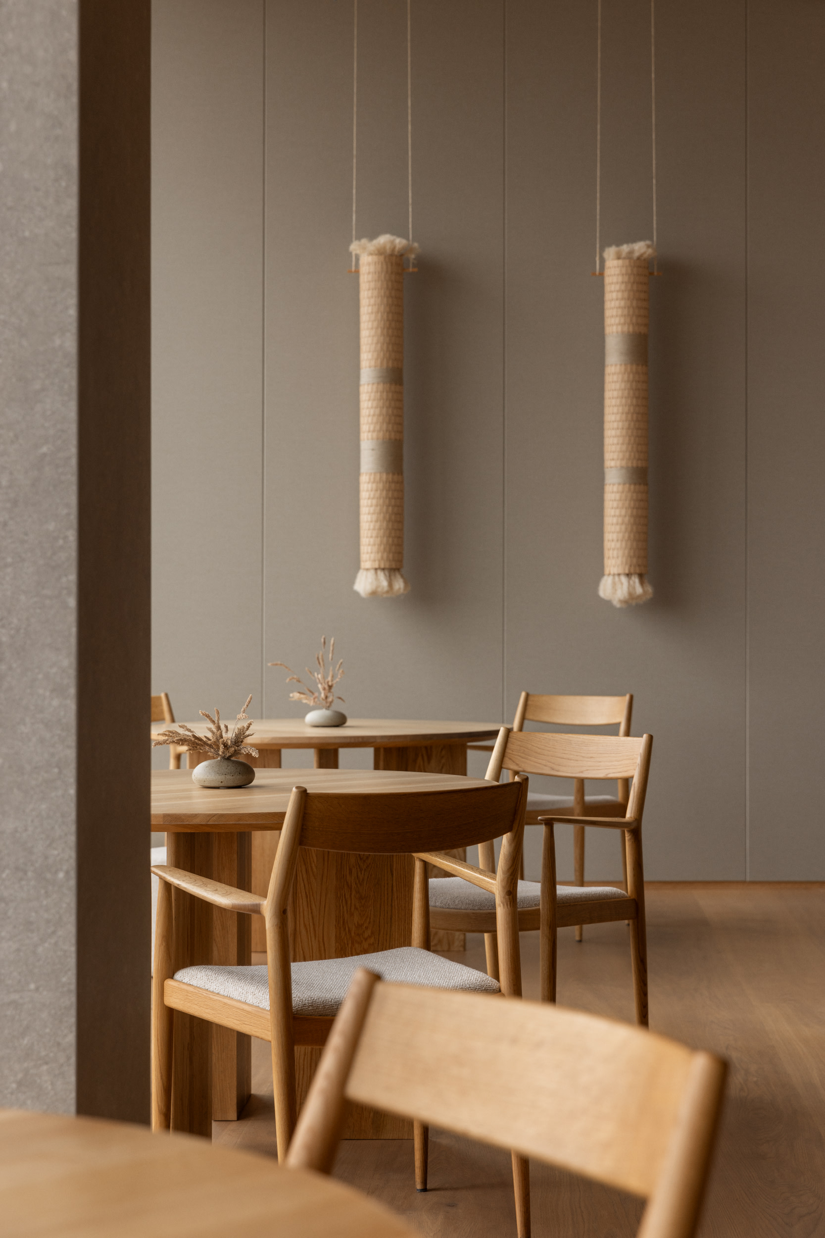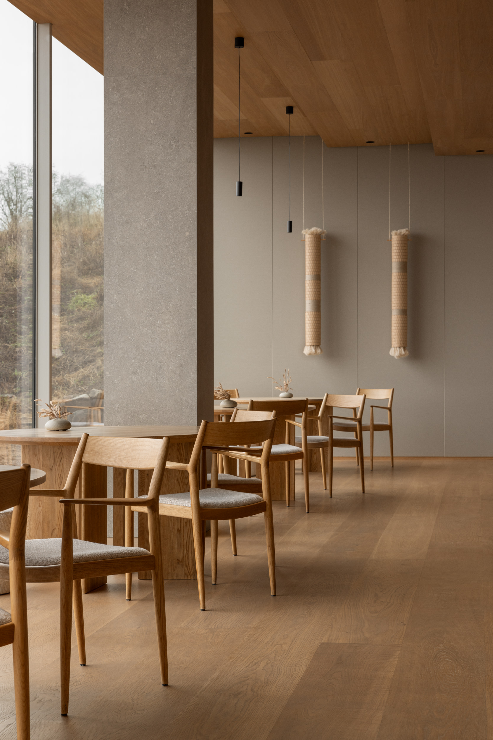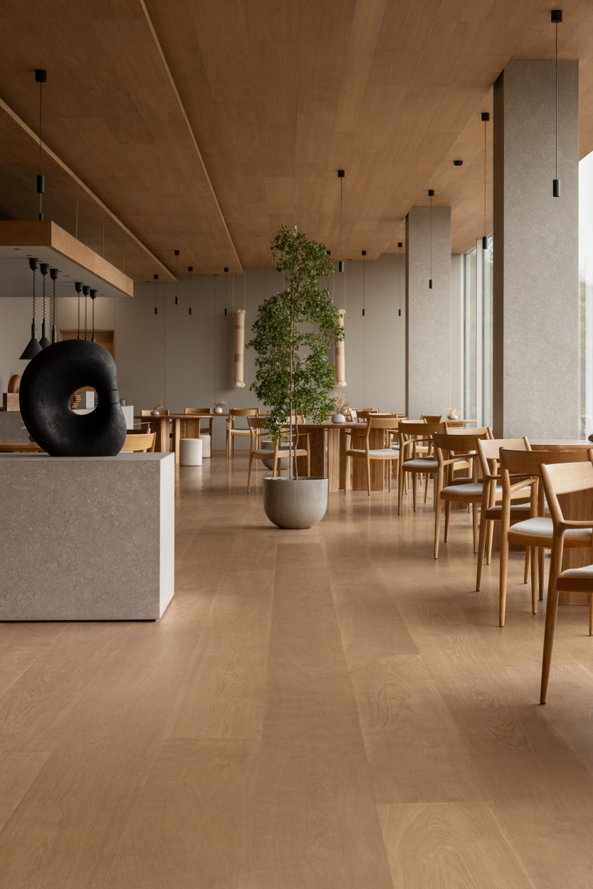 Som gæsterne bevæger sig længere ind i restauranten, spiller træet en mere central rolle. Dinesen Layers i Eg er anvendt i restaurantens middagslokaler og danner en harmonisk baggrund for udspilningen af den gastronomiske tredje akt.