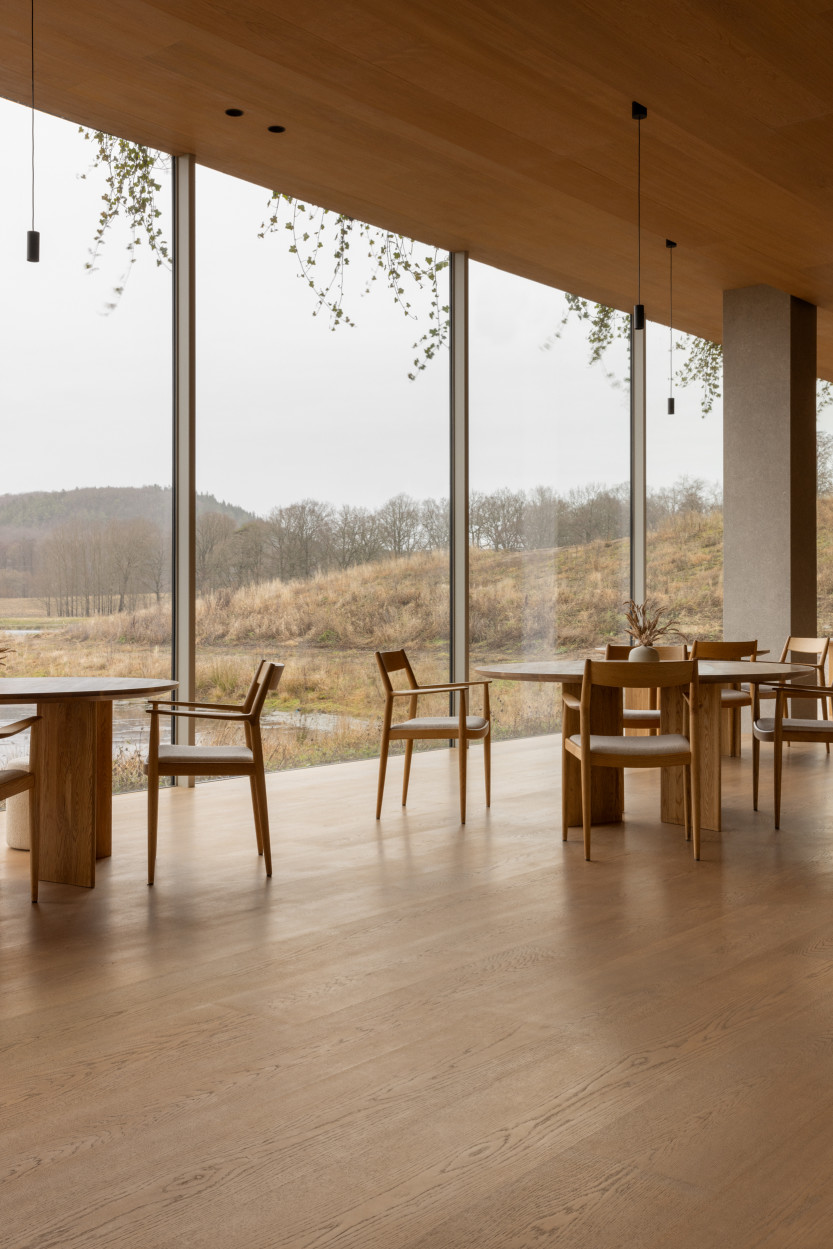 Netop naturen er blevet en essentiel del af restauranten i både arkitektur, interiør og materialer, som er nøje udvalgt og skabt ud fra naturens ressourcer. Således begynder rejsen gennem restauranten. Den stærke forbindelse mellem ude og inde bekræftes, når man træder fra stenene udendørs til stengulvet indendørs, der er en direkte fortsættelse af naturen, restauranten befinder sig i. Det grå stengulv afbalanceres af møblementet i massivt egetræ fra Karimoku og bløde tekstilvægge fra Kvadrat.