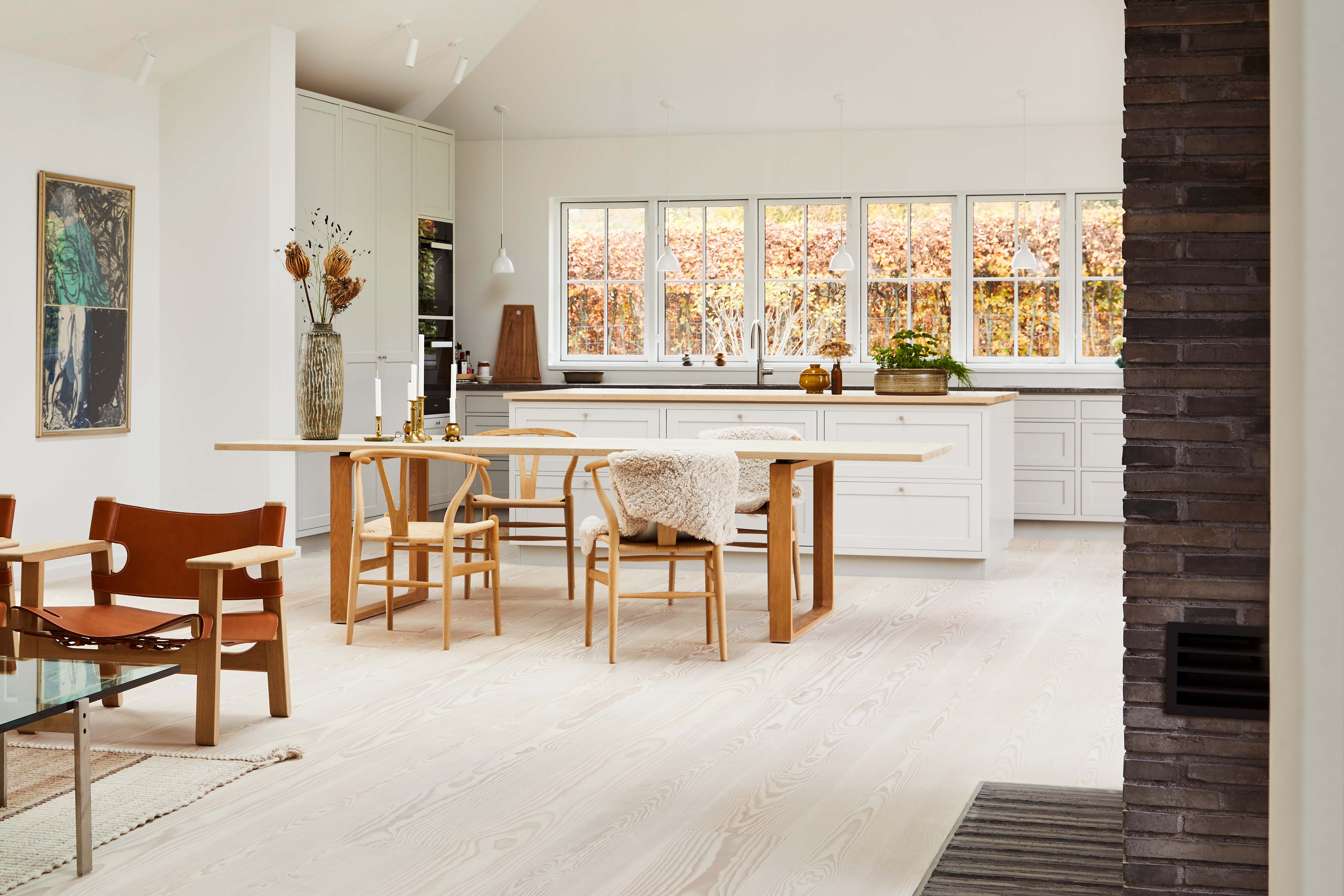 I det ene hus pryder Essay spisebordet i eg, designet af Cecilie Manz, opholdsrummet, tørrede hortensiaer fra haven pynter på bordet og bløde lammeskind luner i de klassiske Wegner y-stole. I døtrenes hus er det Mogens Koch foldestole, der står omkring egetræspisebordet.