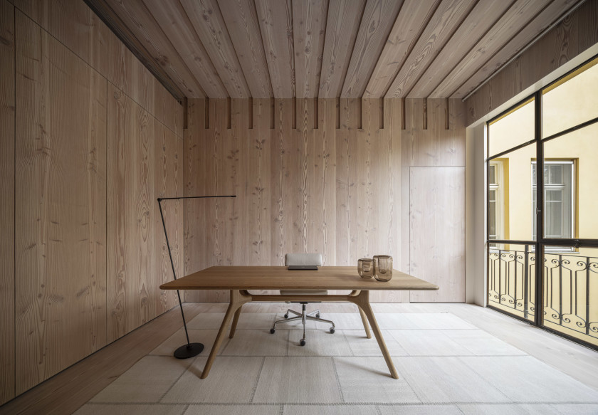 Det var grundtanken at designe et arbejdsrum i forlængelse af hjemmet, så de beroligende rammer, skabt af træet, påvirkede arbejdsmiljøet og understøttede fornemmelsen af at være hensat i den fredfyldte natur.