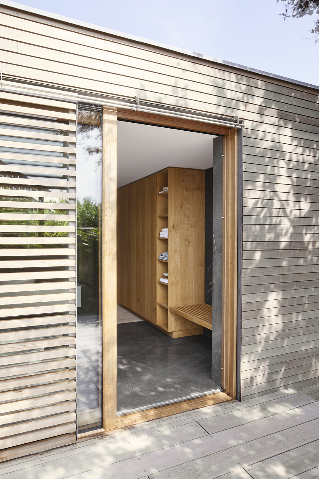 Facaden er bygget i cedertræ, der gradvist forsølver i farven og falder i ét med naturen. Det grønne sedumtag, med mos og sukkulentarter, er til glæde for klimaet og miljøet. Foruden de vandabsorberende og temperaturregulerende effekter danner taget grundlag for en sund biodiversitet for bier og andre insekter.