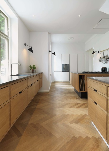 For the renovation of their more than hundred years old Villa, the owners of this private residence chose to have a classic herringbone floor installed in solid Dinesen Oak.