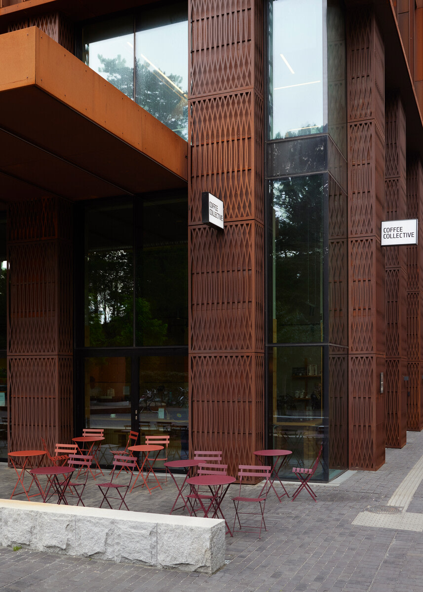 The coffee shop nestles in Pasteur’s Tower – a 2022 building, towering up 120 meters, overlooking the beautiful and historic garden by J.C. Jacobsen. The tower is strikingly contrasting with the historic brick buildings surrounding it. However, its colour, materiality and matte surface blend well with the neighbourhood, contributing to the larger whole.