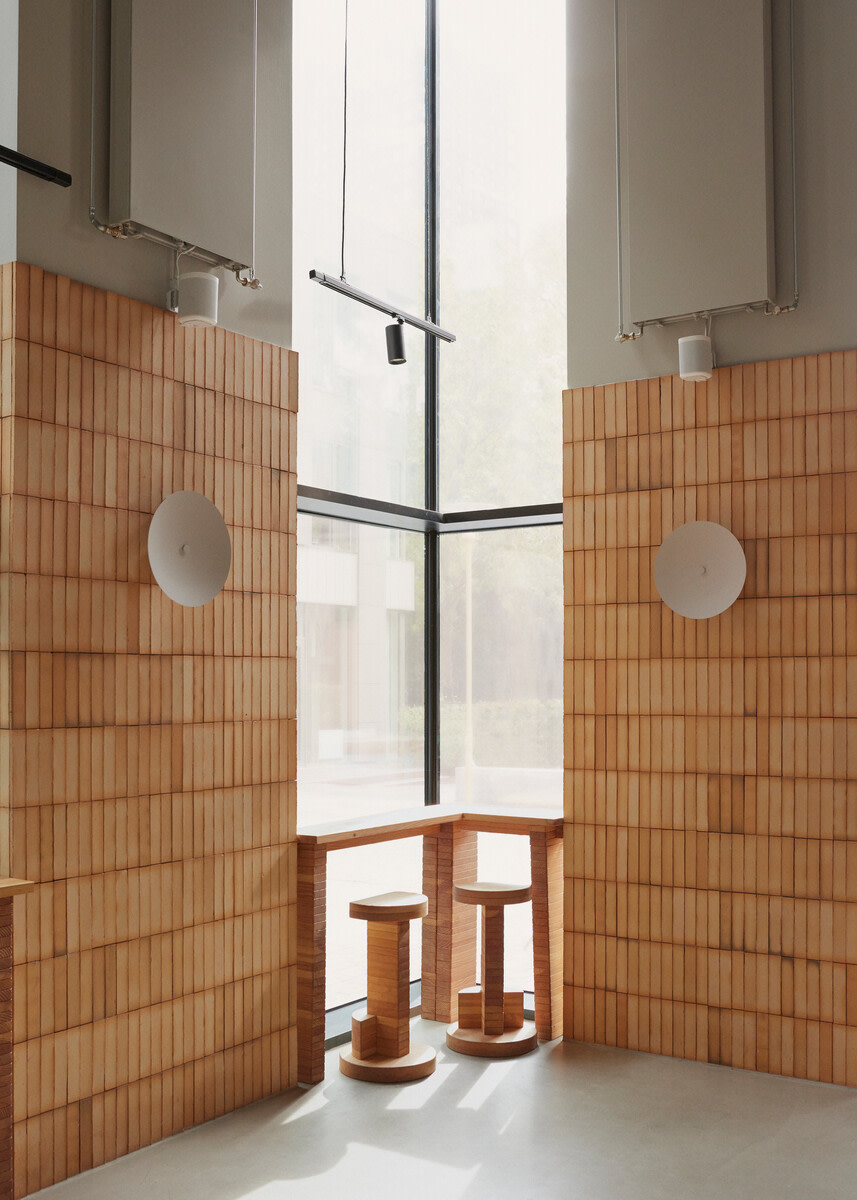 The final product thus fulfils the purpose of longevity and recycling as it is crafted from untreated, leftover wood. DS carefully limited the use of screws and glue to make the design flexible and reusable. So, if the Coffee Collective shop in Carlsberg Byen ever gets repurposed, its furniture can be dismantled, and the 4,795 wooden offcuts pieces reused.