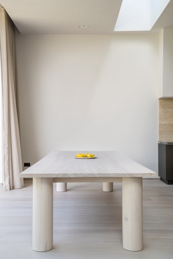 Das Erdgeschoss wurde mit einem modernen Anbau erweitert, in dessen Zentrum ein maßgeschneiderter, von Benchmark hergestellter Esstisch aus massivem Eschenholz steht. Die Erweiterung bietet mit ihren großen deckenhohen Fenstern, die den Raum mit Licht durchfluten, freien Blick auf den neu angelegten Garten. Der Anbau wurde von RLD als Herz des Hauses konstruiert und soll zudem die Original-Architektur des Gebäudes ergänzen.
