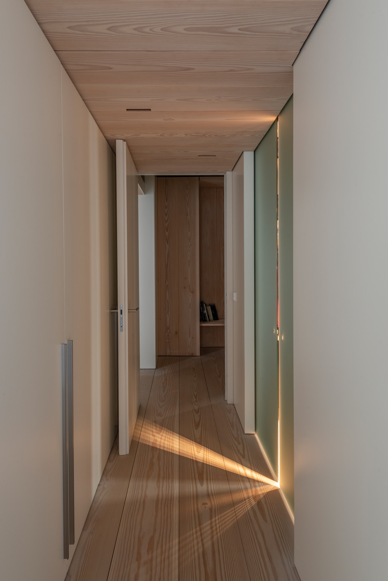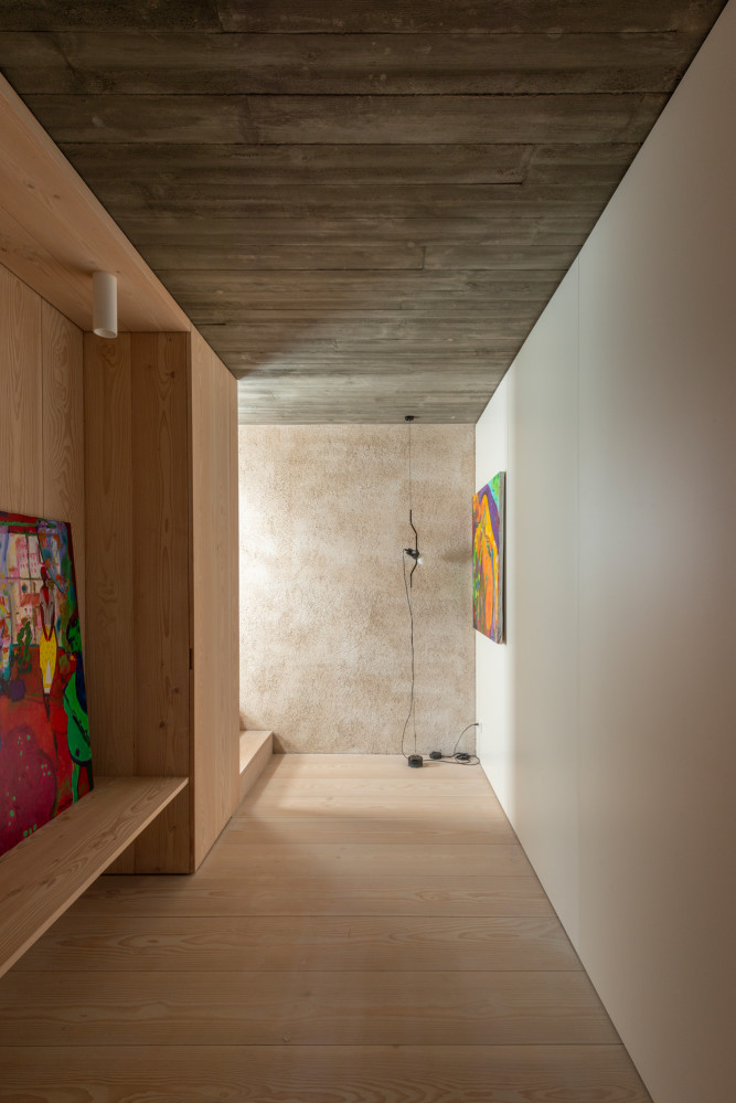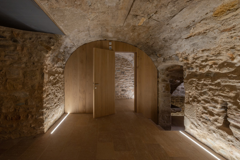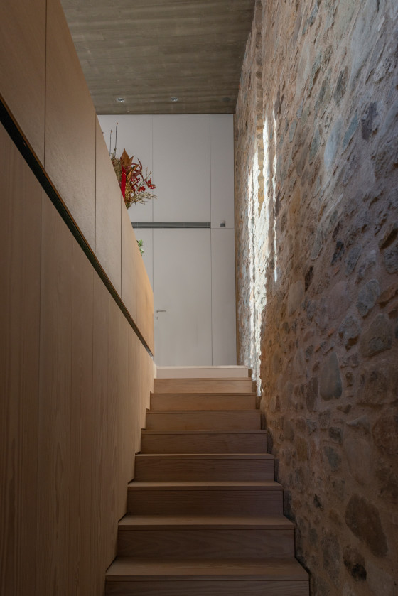 Vorhandene Materialien wie beispielsweise die Steinplatten der Terrasse oder Quader- und Mauersteine wurden wiederverwendet. Dinesen Douglasiendielen ergänzen die alten Steine des Hauses und den freiliegenden Beton, in dem Abdrücke der Verschalungsbretter Marmorierungen bilden, die mit den Maserungen im Holz harmonieren. Während des Bauprozesses haben die Architekten größten Wert darauf gelegt, traditionelle Techniken zu bewahren, um einerseits eine stringente Architektur zu schaffen und andererseits das Neue und das Vorhandene auf bestmögliche Weise zu integrieren.
