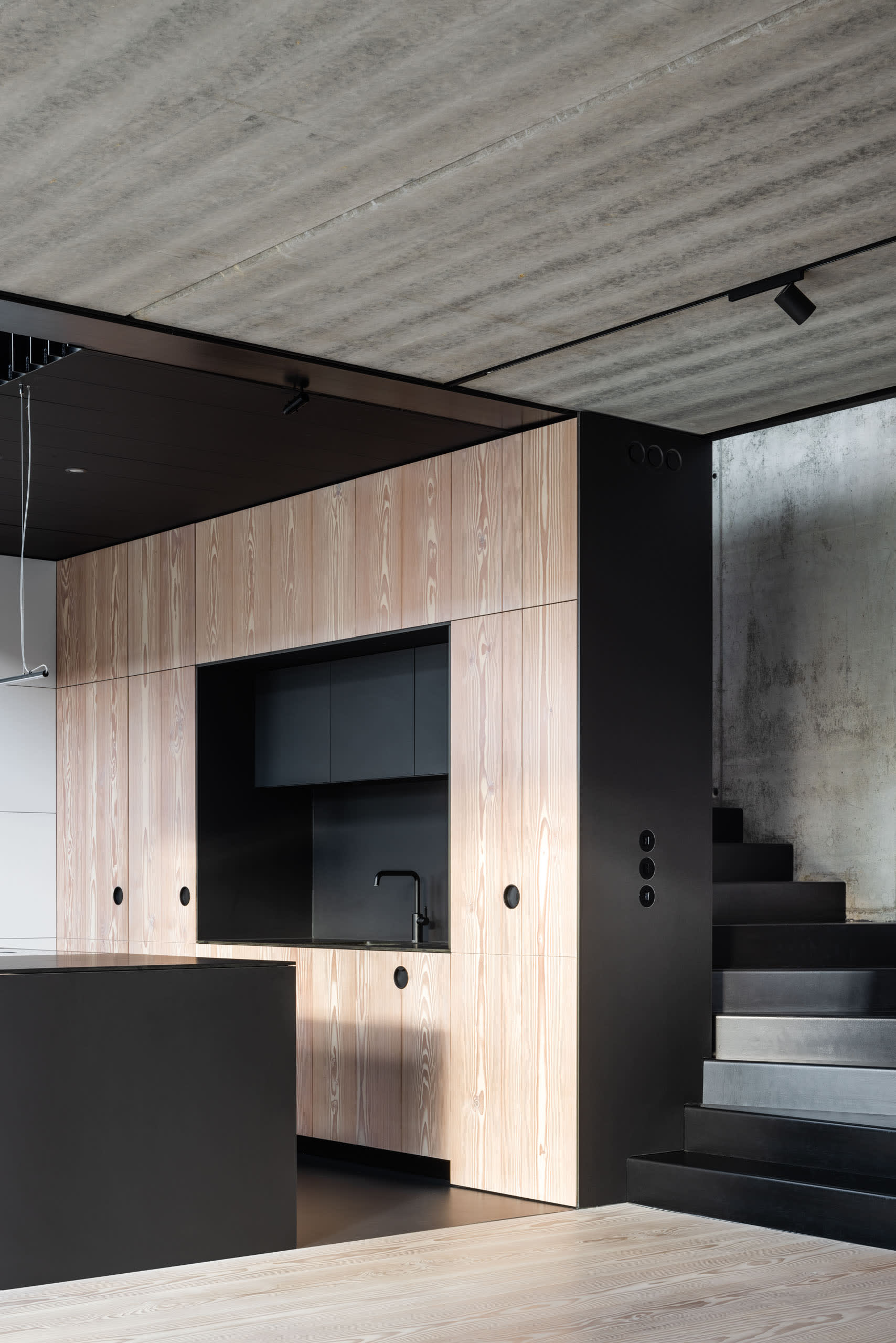 Ein wichtiges Element für Atrium Architekti war die Schaffung einer Kohärenz zwischen Innen und Außen auf horizontaler Ebene, aber auch vertikal, wobei sich das Douglasienholz in einer fließenden Bewegung vom Fußboden in der Wohnküche zu den senkrechten Flächen der Küchenelemente erhebt.