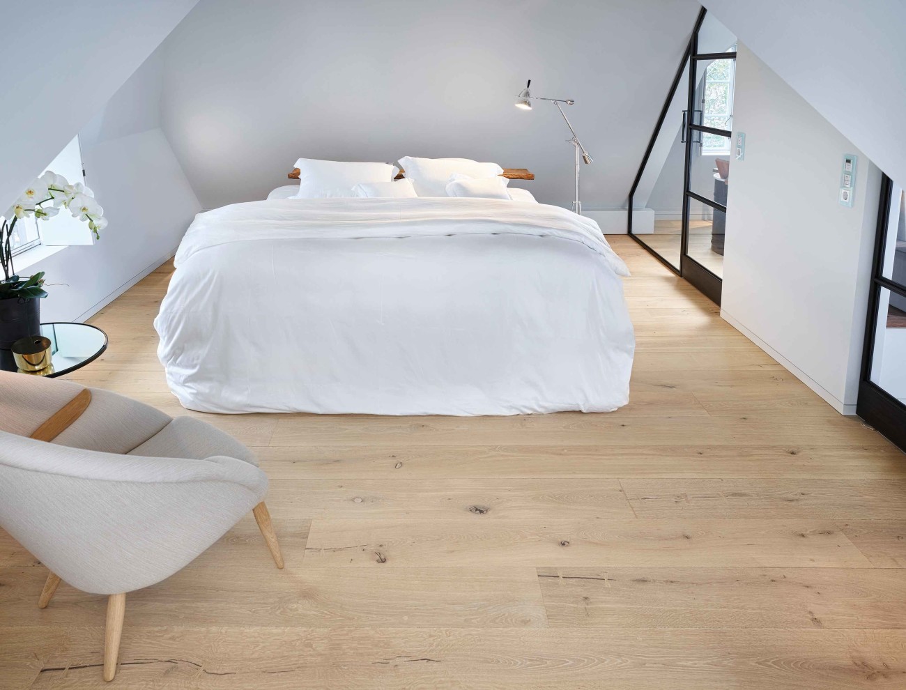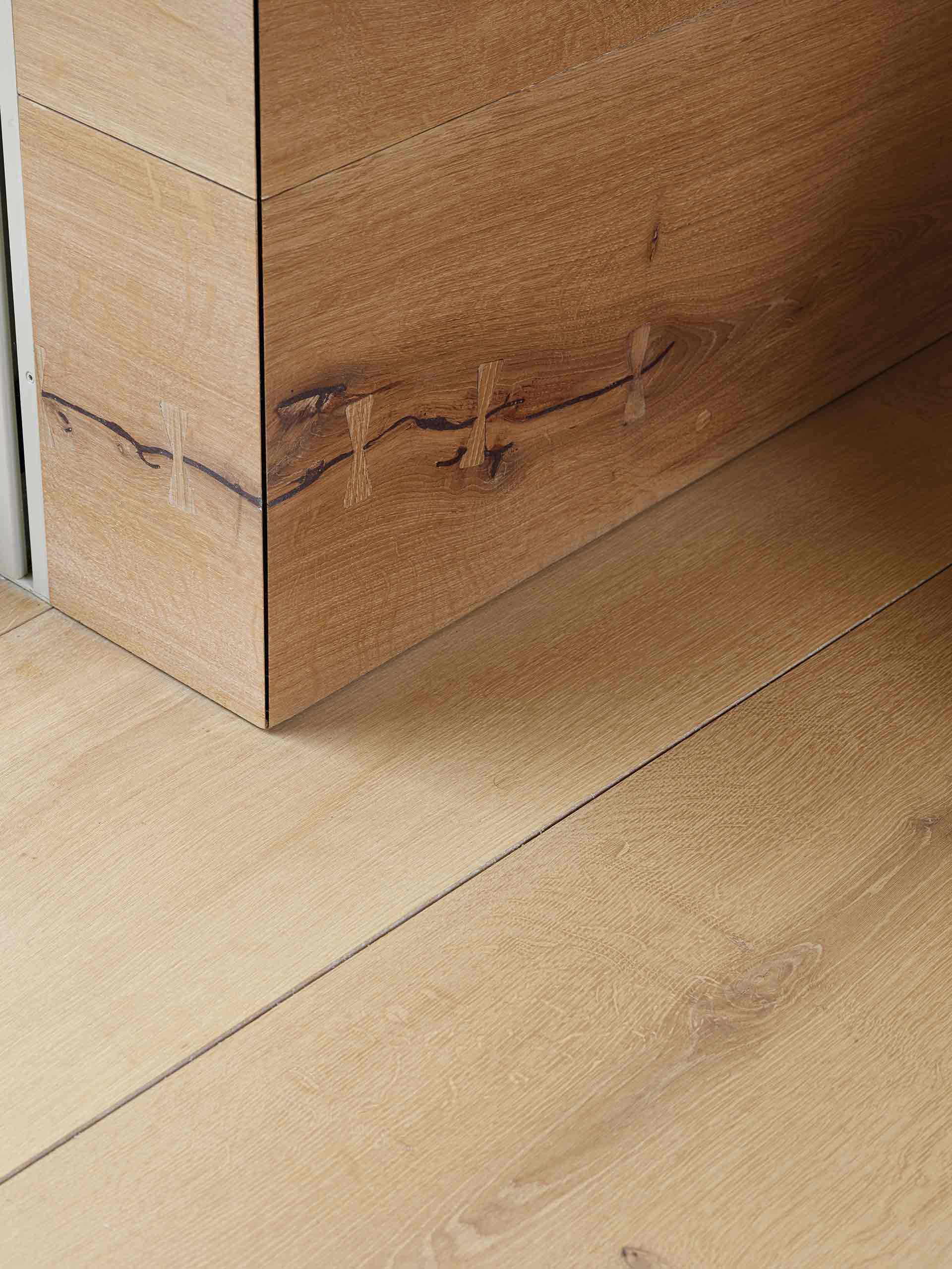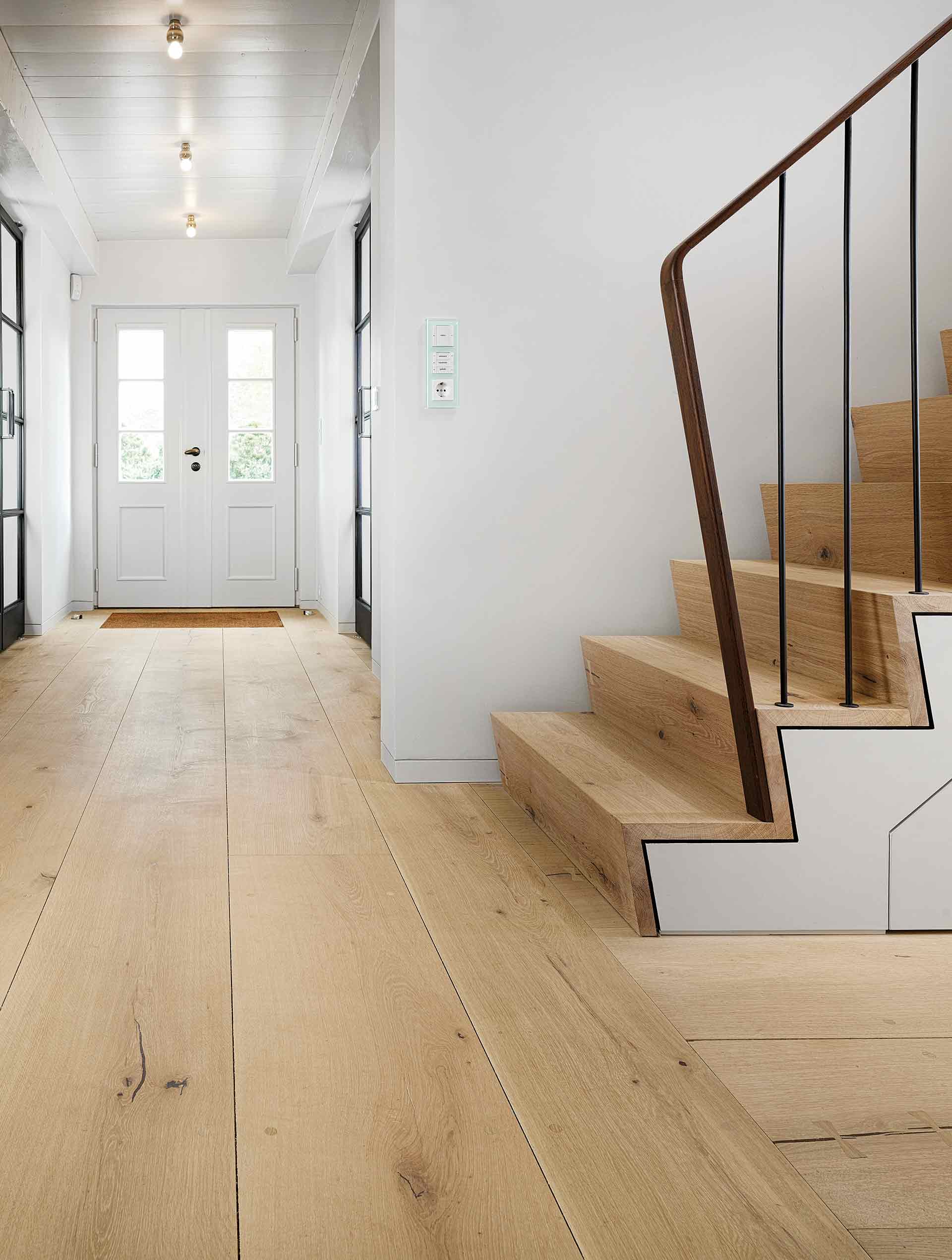 The exceptionally wide HeartOak planks come from the heart of the tree, and out of respect for the old oak trees, natural cracks have been preserved. As a particularly beautiful detail, the cracks are locked by butterfly joints of oak.