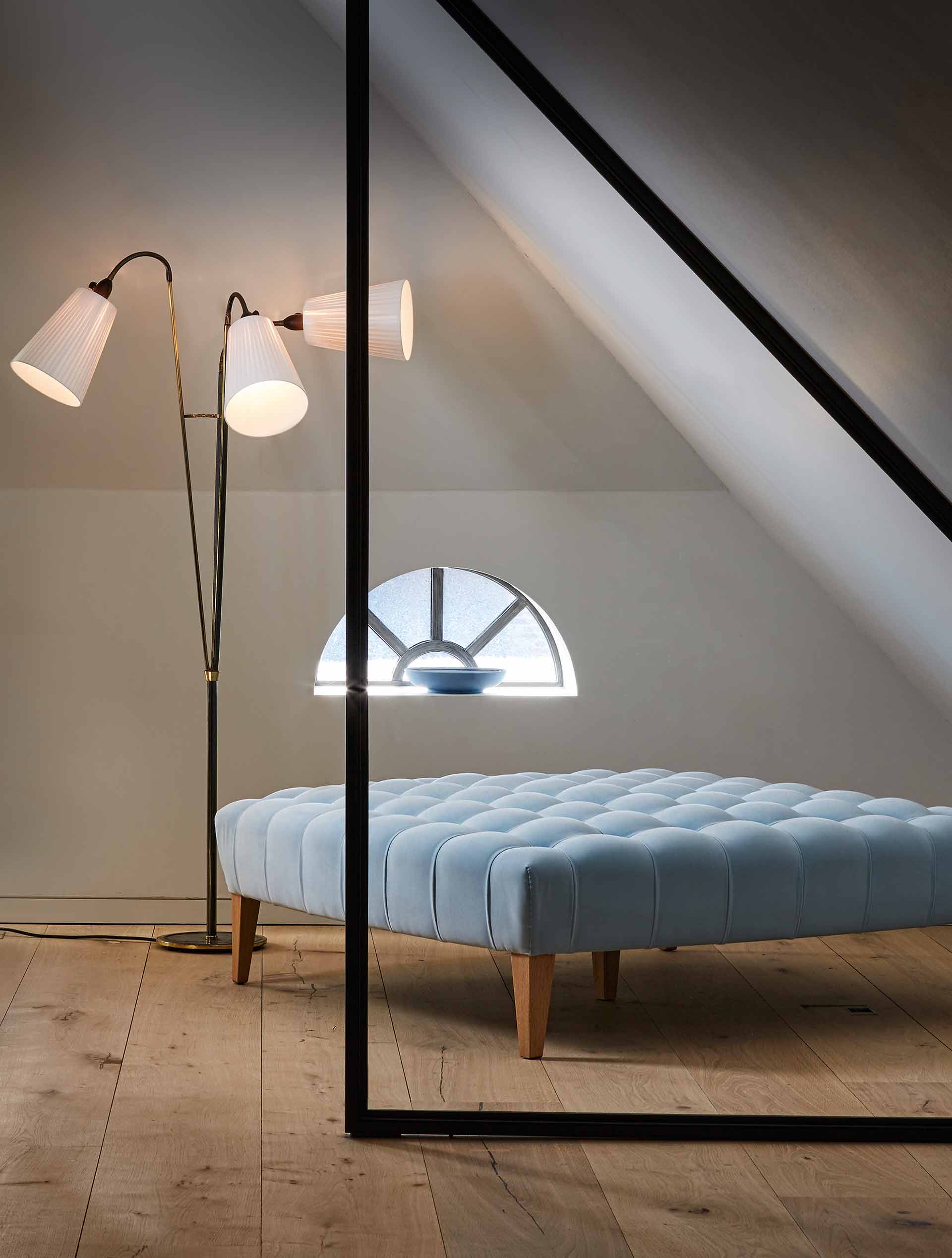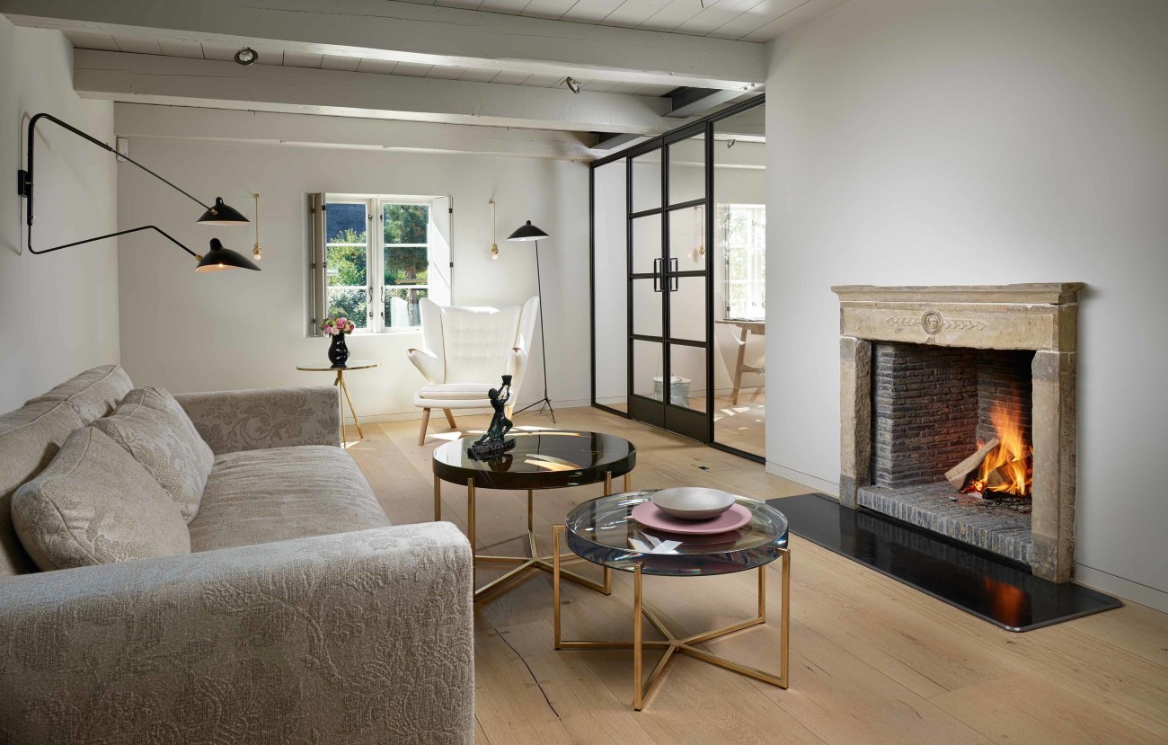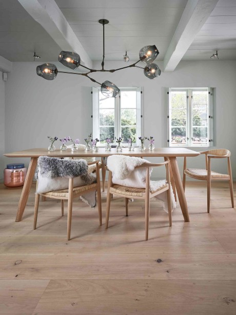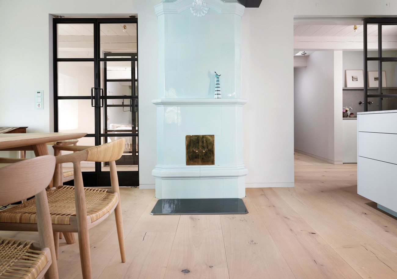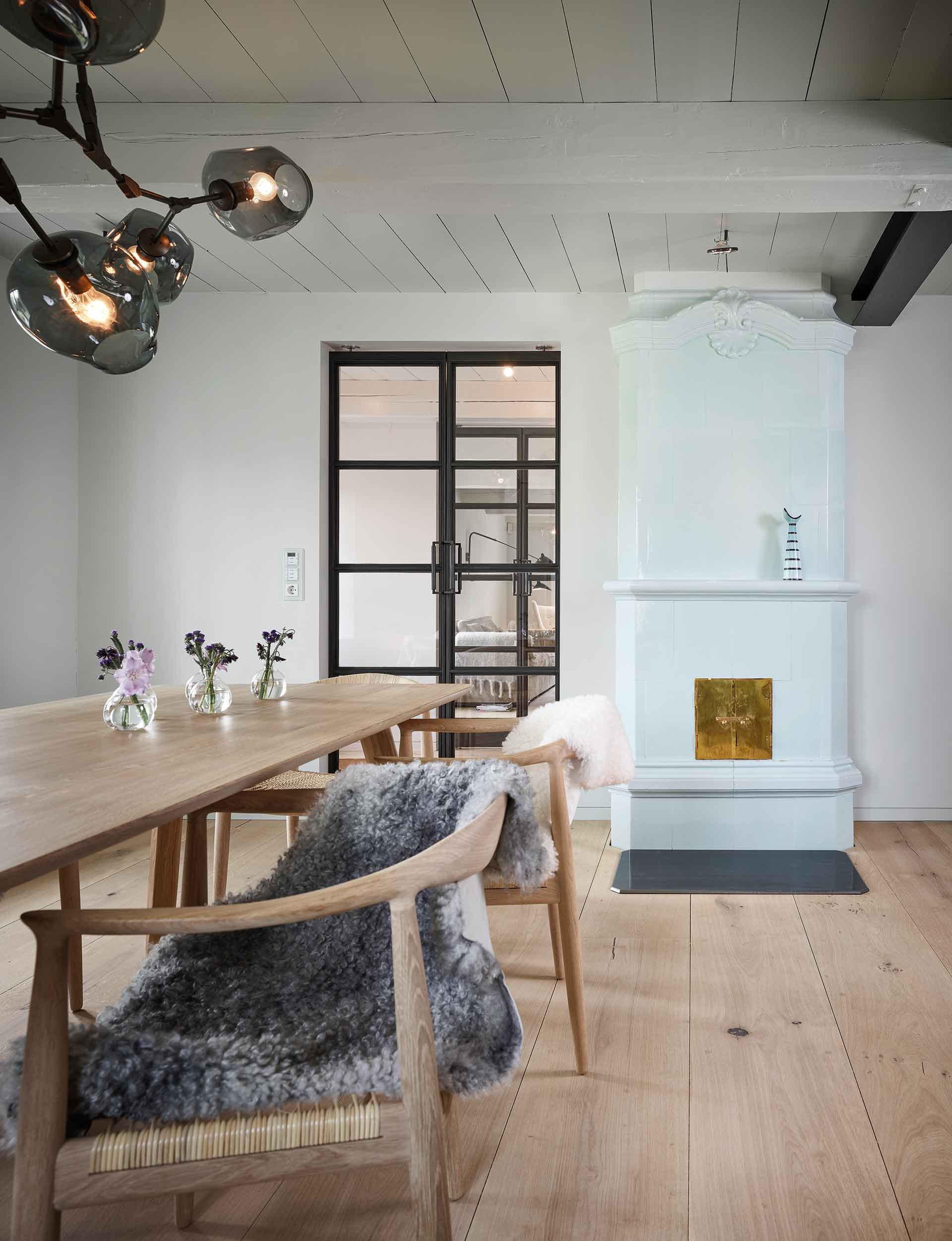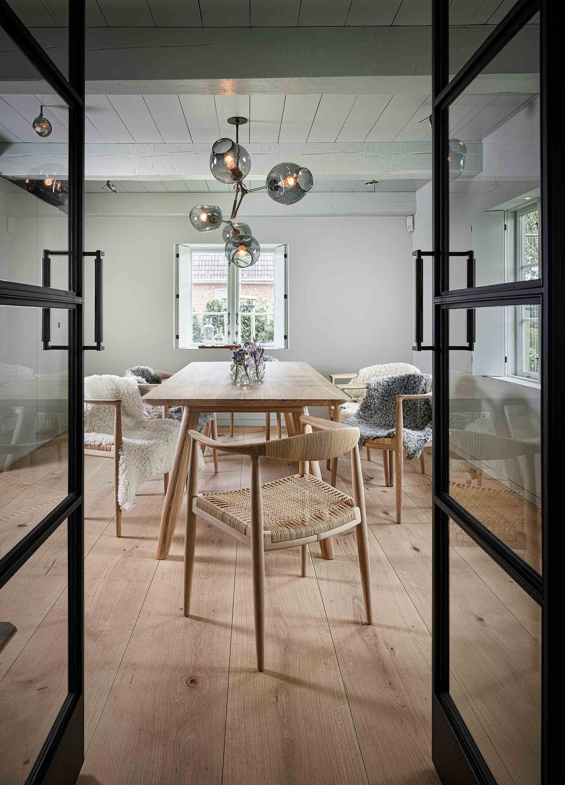 The house is in two floors and has been renovated with respect for the history of the old farm. The classic style is retained with the addition of a modern twist. You find the characteristic Dinesen HeartOak floors in every room, each elegantly separated by industrial glass sections.
