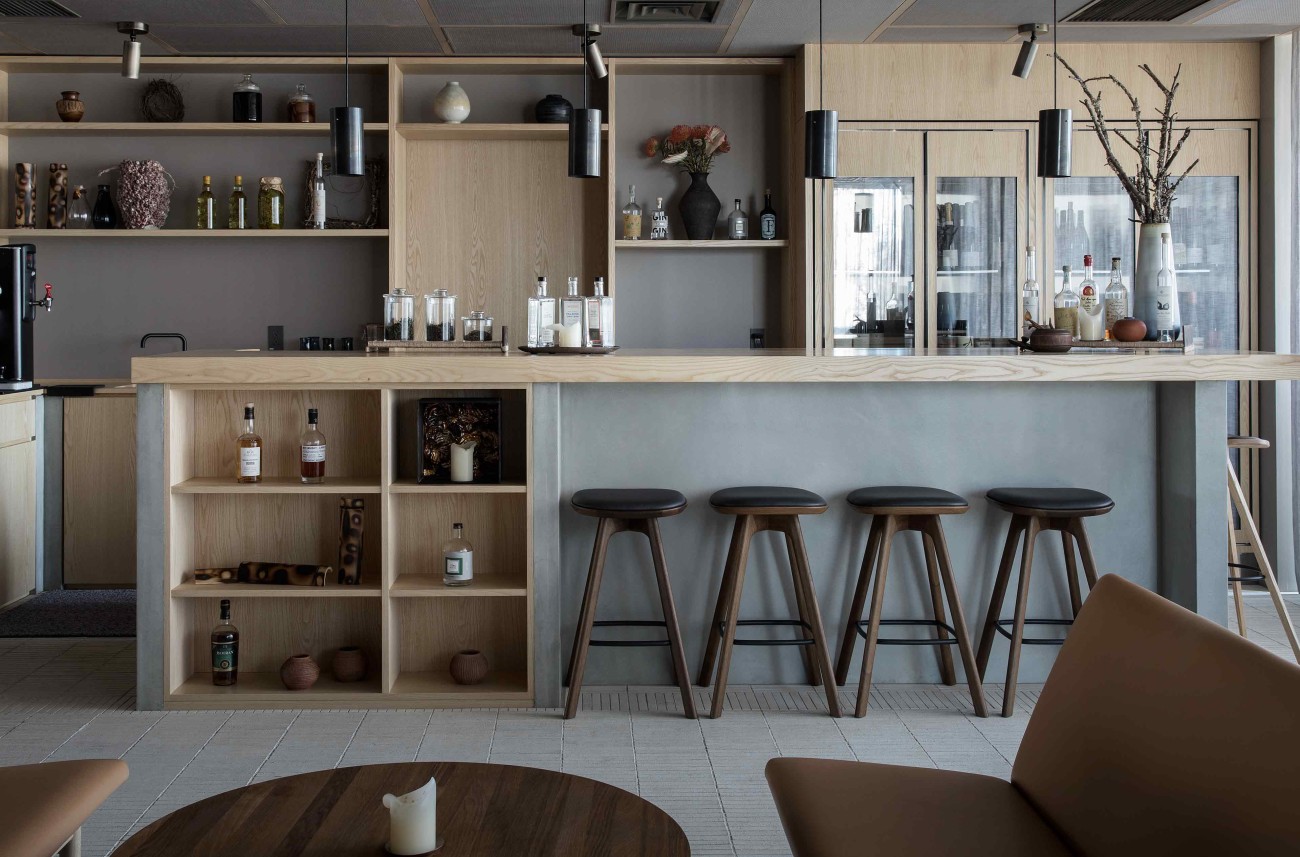 The restaurant and bar design, which can seat 60, comprises a mix of dining-height and high counter seating offering a range of views out across the city skyline. In the restaurant, OEO Studio designed the new Jari dining table series with table tops resembling pebbles softly shaped by water and nature over time.