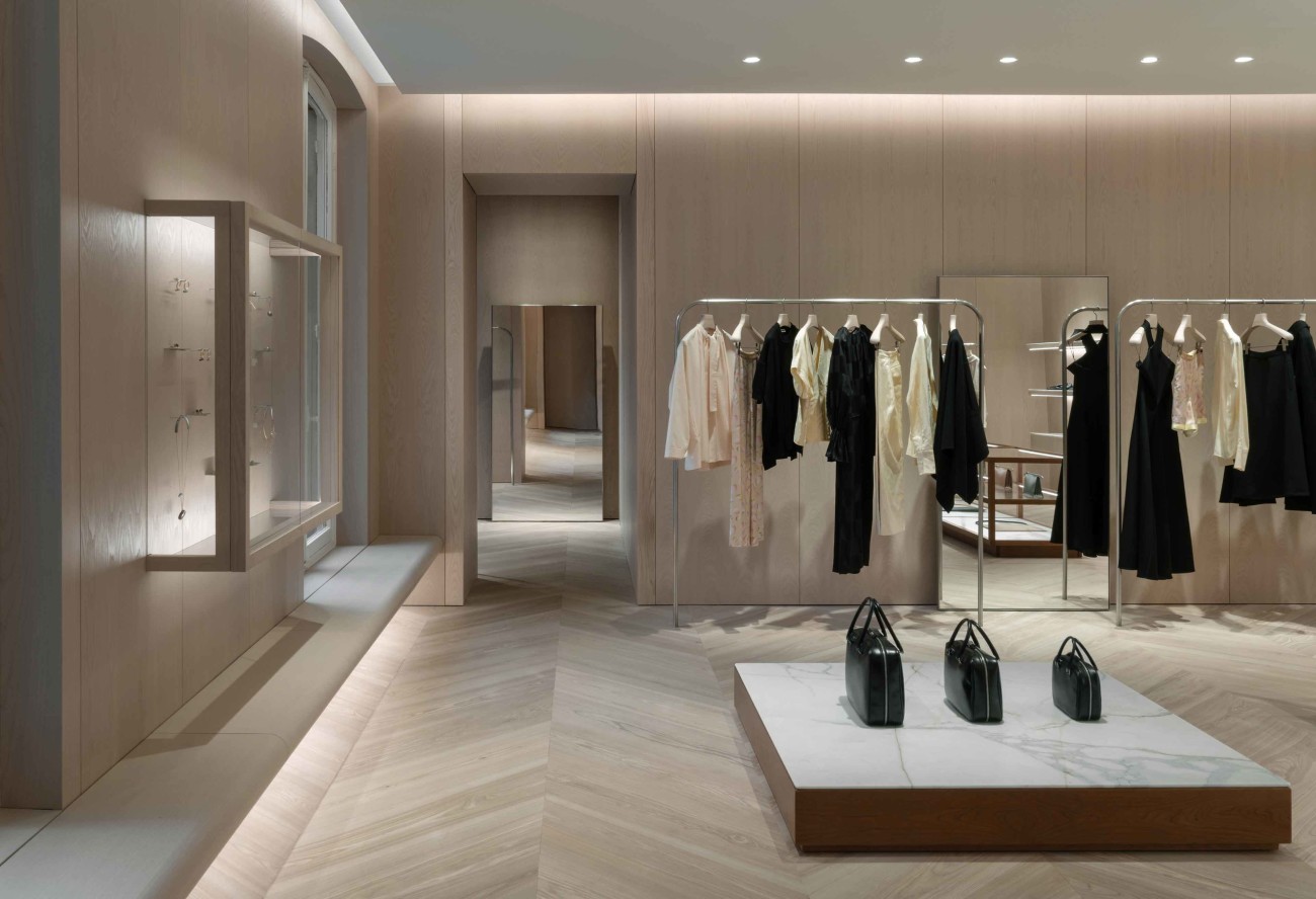 In a historical listed building in Paris, John Pawson has, in collaboration with Jil Sander creative directors Lucie and Luke Meier, created the new Jil Sander flagship store. The elegant store feels grand and warm at the same time — with a beautiful chevron flooring and sculptural staircase in Dinesen Ash tying together the different rooms.
