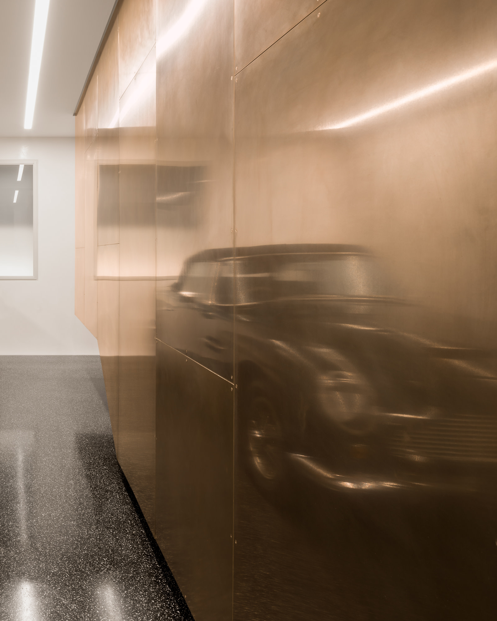 Um das räumliche Erlebnis zu bereichern, arbeitete Nord Studio mit einer raffinierten und attraktiv alternden Materialpalette, die von Metall über Stein bis hin zu Holz reicht. So wurde der untere Teil des Gebäudes, der als Garage für die Automobilsammlung des Eigentümers fungiert, mit einem Mix aus weißem Marmor und Asphalt eingerichtet. Große Flächen aus rustikalem Metall reflektieren das Licht und die wertvollen Schätze der Garage.