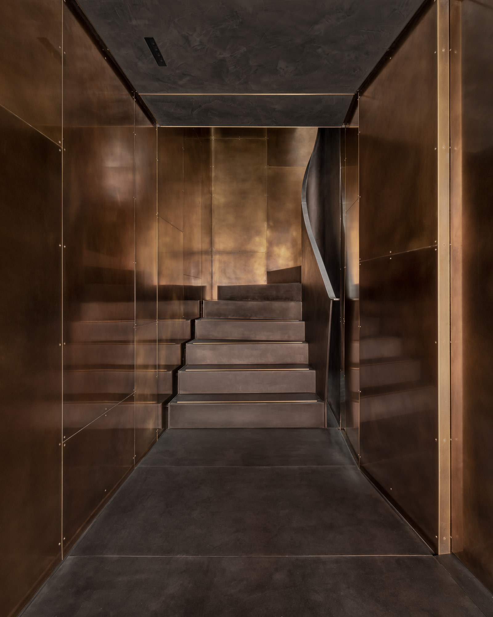 Eine Halbwendeltreppe aus Baustahl mit Verkleidung aus handpatinierten Messingpaneelen verbindet die Stockwerke und sorgt für Kohärenz von der Garage bis zu den Wohnräumen. Um zenitales Licht zu schaffen, installierten die Architekten ein großzügiges Oberlicht über dem zentralen Treppenhaus, dessen Öffnung Zugang zum Dach sowie natürliche Belüftung mit Frischluft ermöglicht.