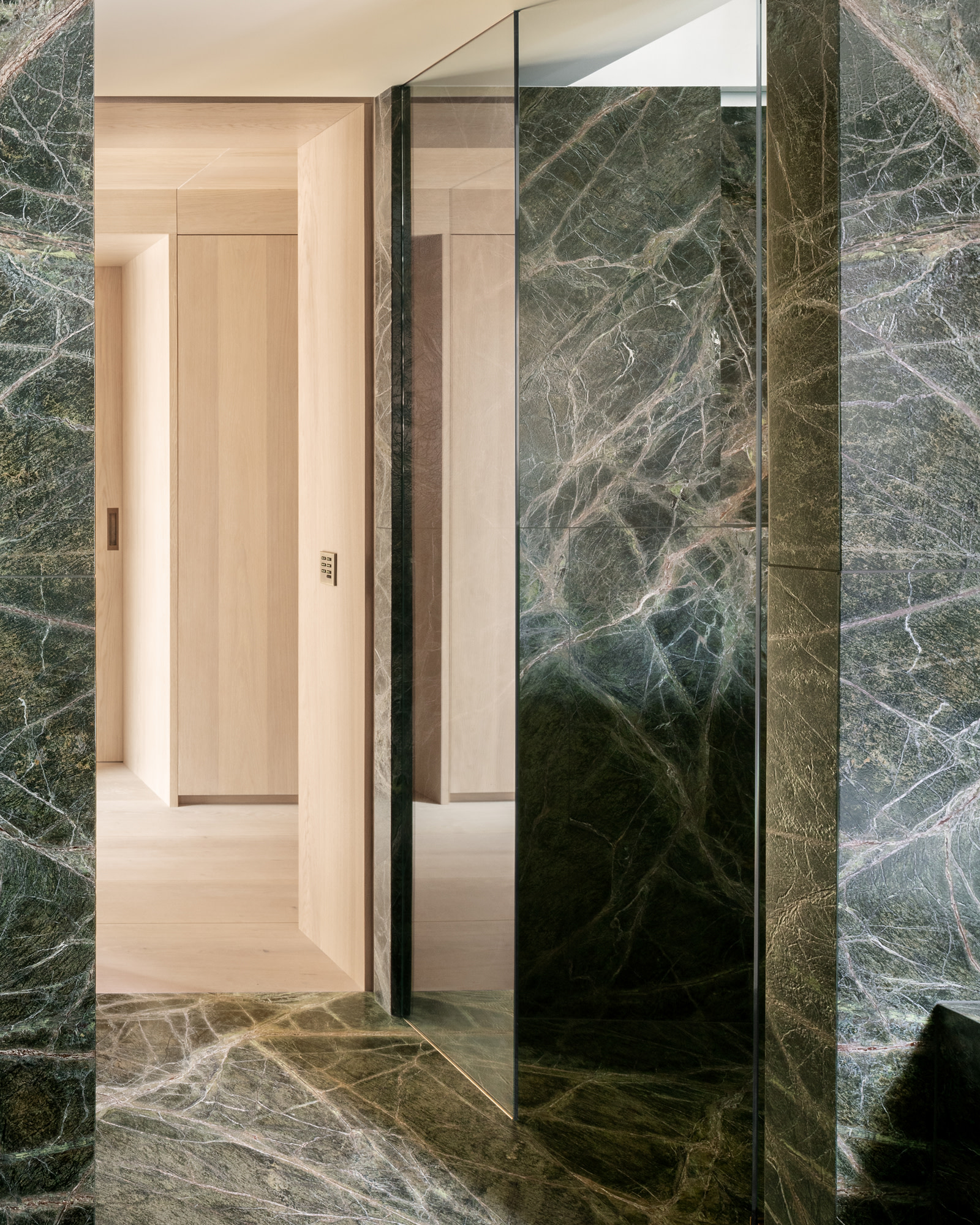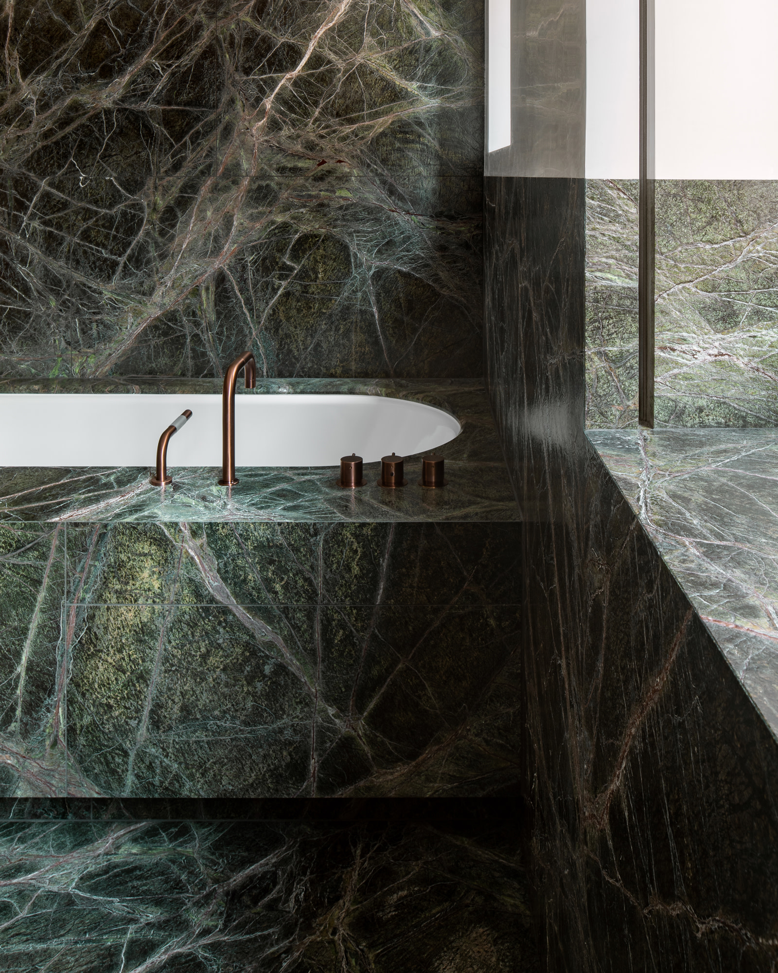 Die Badezimmer wurden in jeweils eigener Farbe und Textur mit großen Fliesen aus italienischem Naturstein gestaltet, um eine besondere Stimmung und Intimität zu erzeugen.