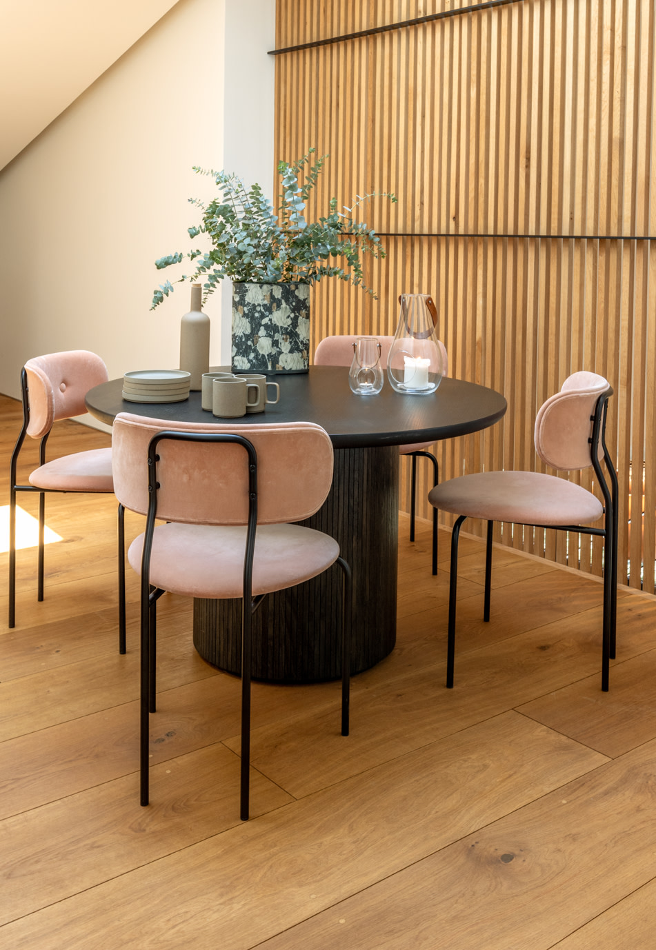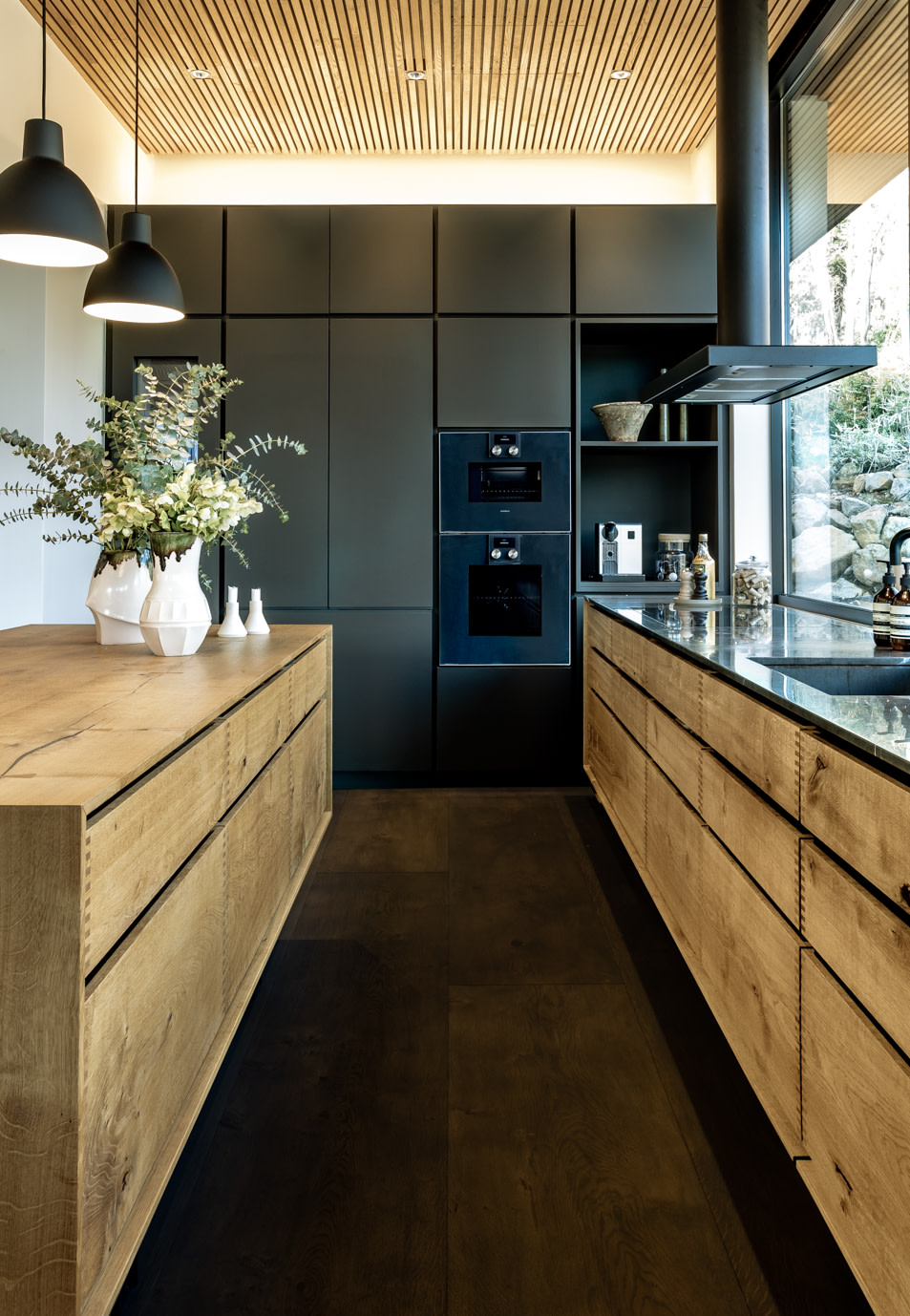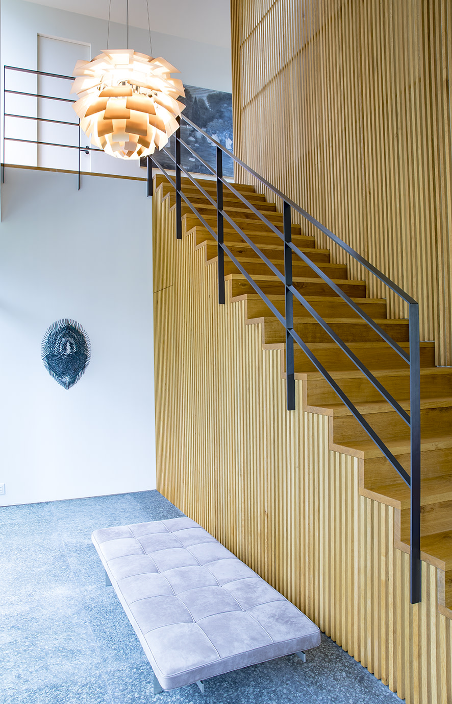 Eingerichtet ist das Haus mit bekannten Möbelklassikern dänischer Designer, von Hans J. Wegner bis Børge Morgensen. Die speziell angepasste Küche von Garde Hvalsøe im Herzen des Hauses zeichnet sich durch Holzelemente aus Dinesen HeartOak aus. Daher lag es auf der Hand, in allen Stockwerken Massivholzböden aus HeartOak von Dinesen zu verlegen. Ein raffiniertes Detail, das Räume und Stockwerke voneinander absetzt, ist die Oberflächenbehandlung der Böden. So wechseln die Holznuancen von Hell über Natur zu Dunkel und weisen die Struktur einer dreifachen Farbpalette auf.