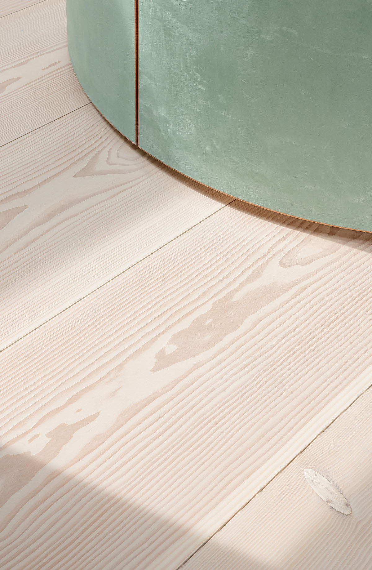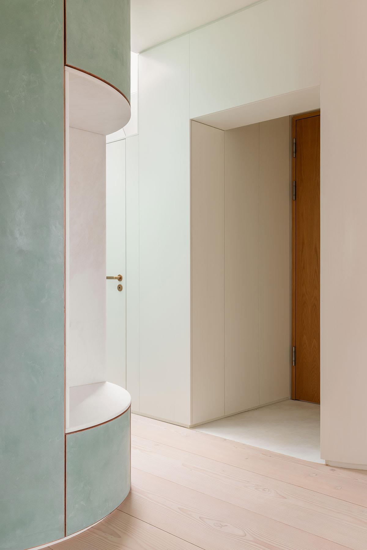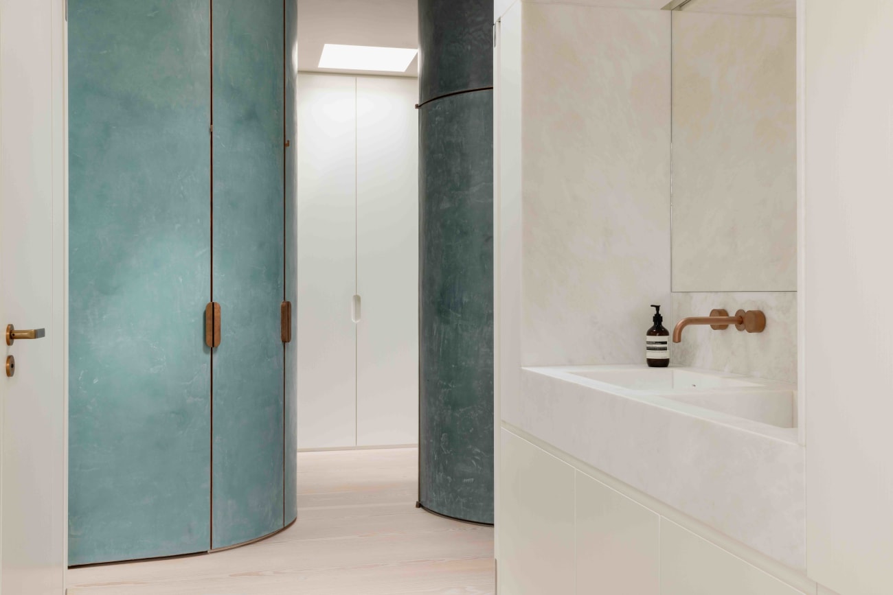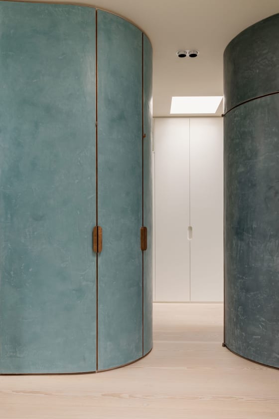 Die offene Mittelzone umfasst drei Baukörper, in denen der Technikraum, die Gäste- und die Hauptdusche sowie Waschmaschine und Trockner untergebracht sind. Die Farben dieser Baukörper sind vom satten Grün der Baumwipfel und vom Blaugrau der sich kräuselnden, leicht schimmernden Oberfläche der Spree inspiriert und bringen die Nuancen der umgebenden Naturelemente direkt ins Herz der Wohnung.