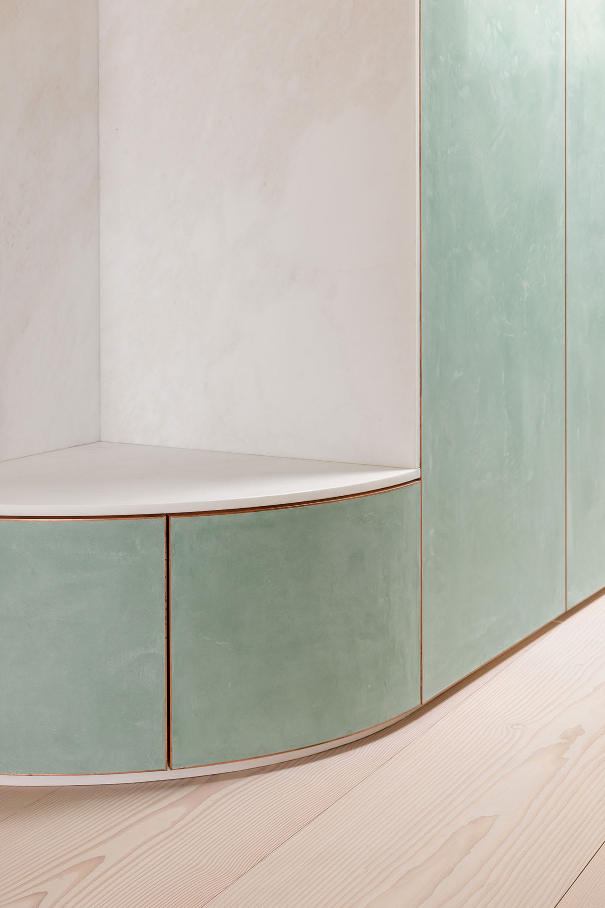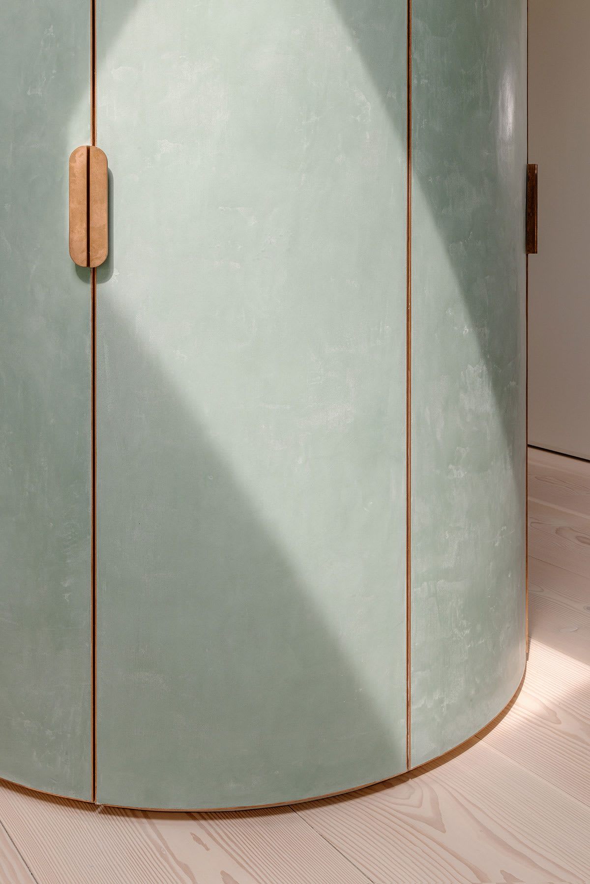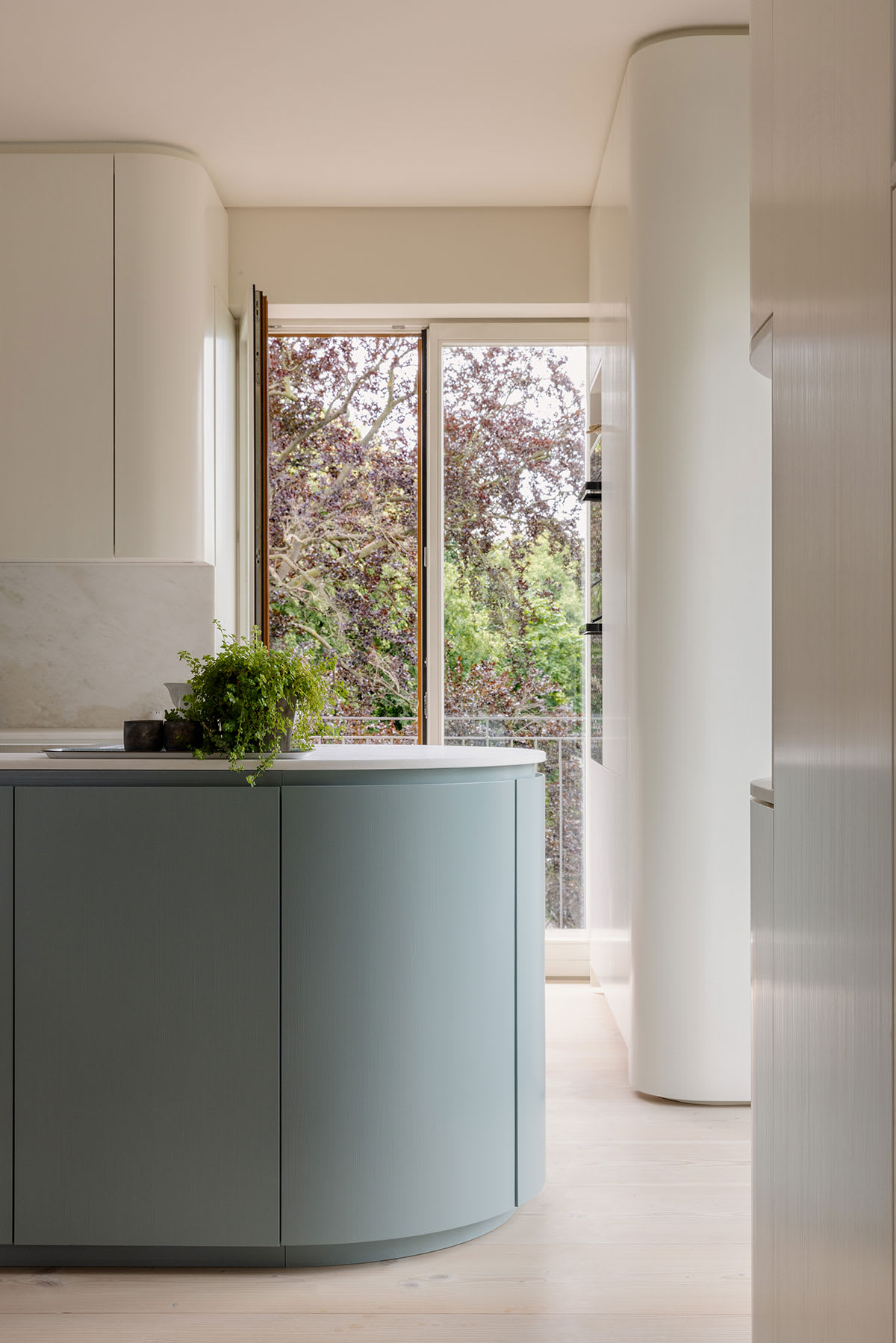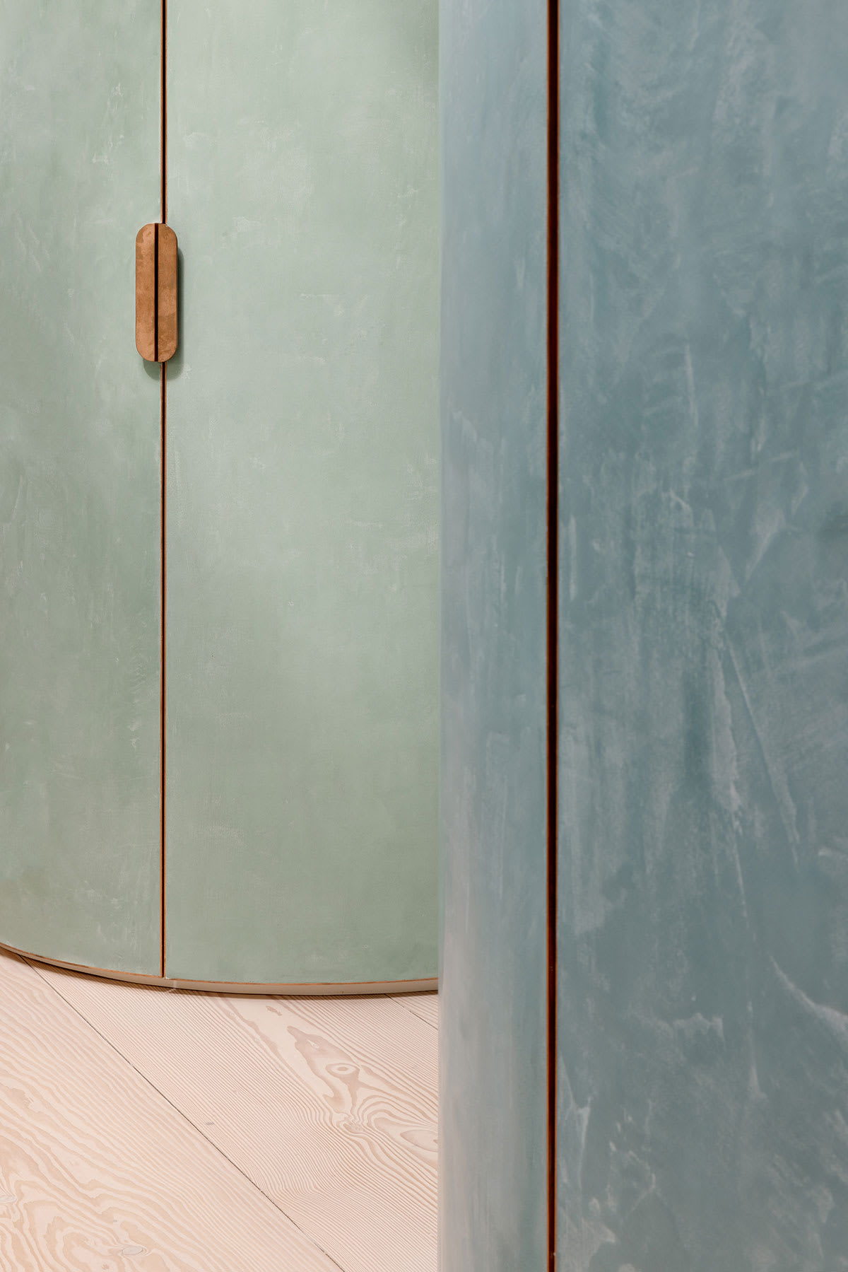 Die offene Mittelzone umfasst drei Baukörper, in denen der Technikraum, die Gäste- und die Hauptdusche sowie Waschmaschine und Trockner untergebracht sind. Die Farben dieser Baukörper sind vom satten Grün der Baumwipfel und vom Blaugrau der sich kräuselnden, leicht schimmernden Oberfläche der Spree inspiriert und bringen die Nuancen der umgebenden Naturelemente direkt ins Herz der Wohnung.