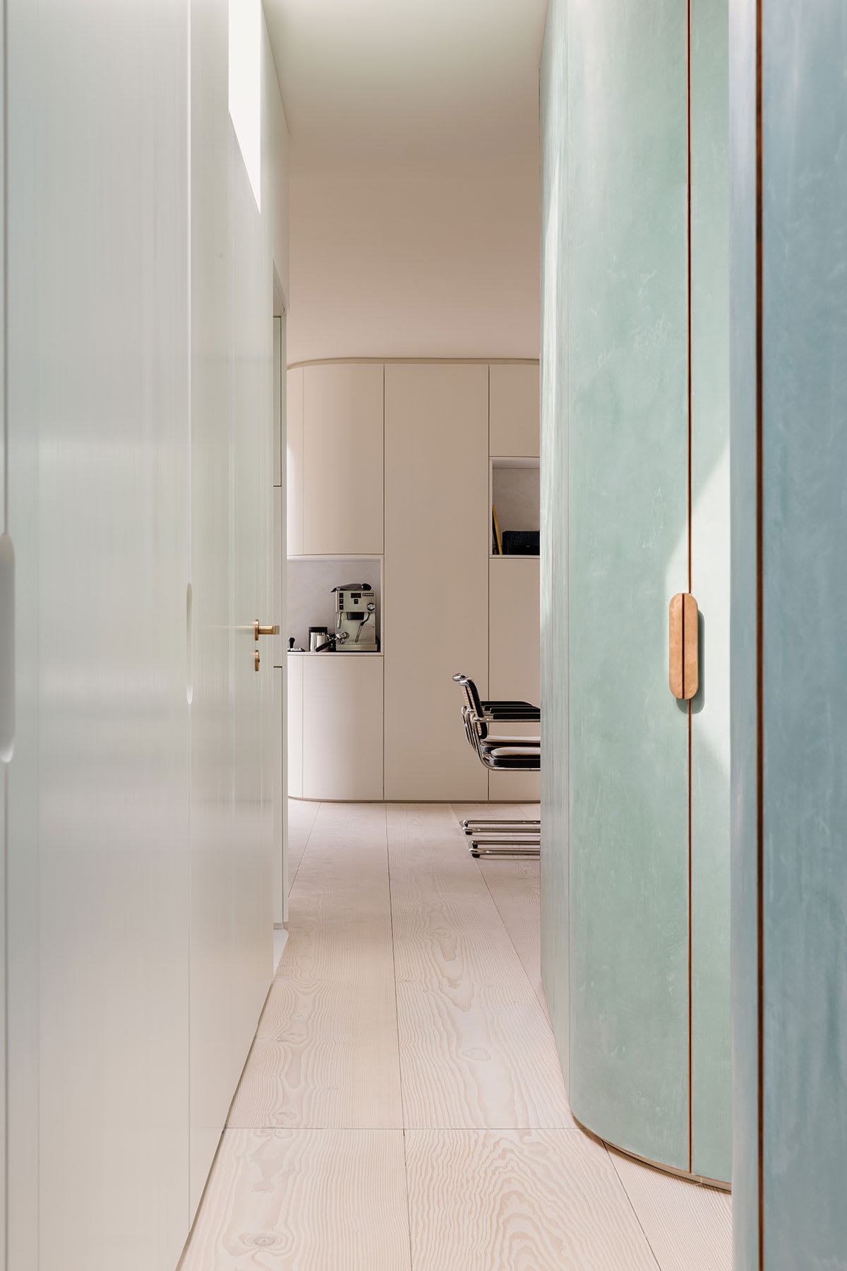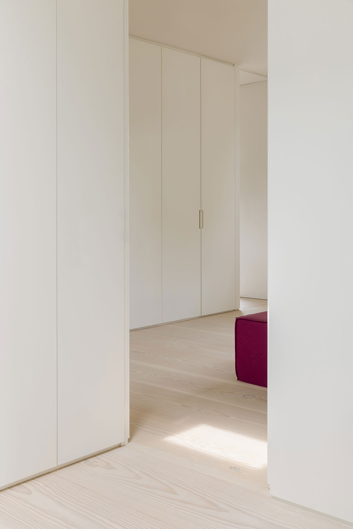 Dank der neuen Raumtypologie können sich die Bewohner auf verschiedenen Wegen durch die Wohnung bewegen. Raumhohe flächenbündige Türen, die nahtlos und ohne sichtbaren Rahmen in die Wände integriert sind, trennen die Räume, was eine klare und ruhige Atmosphäre entstehen lässt
