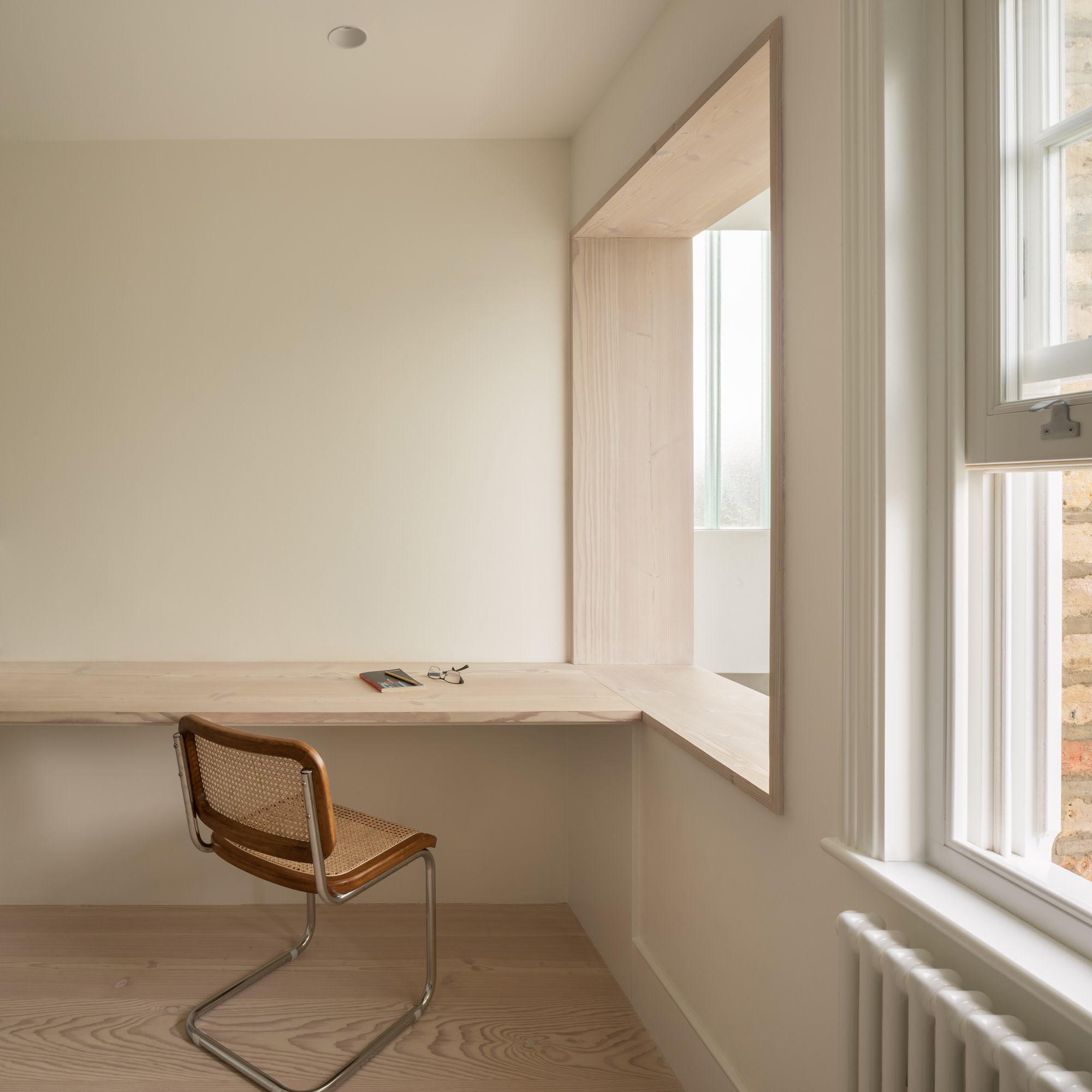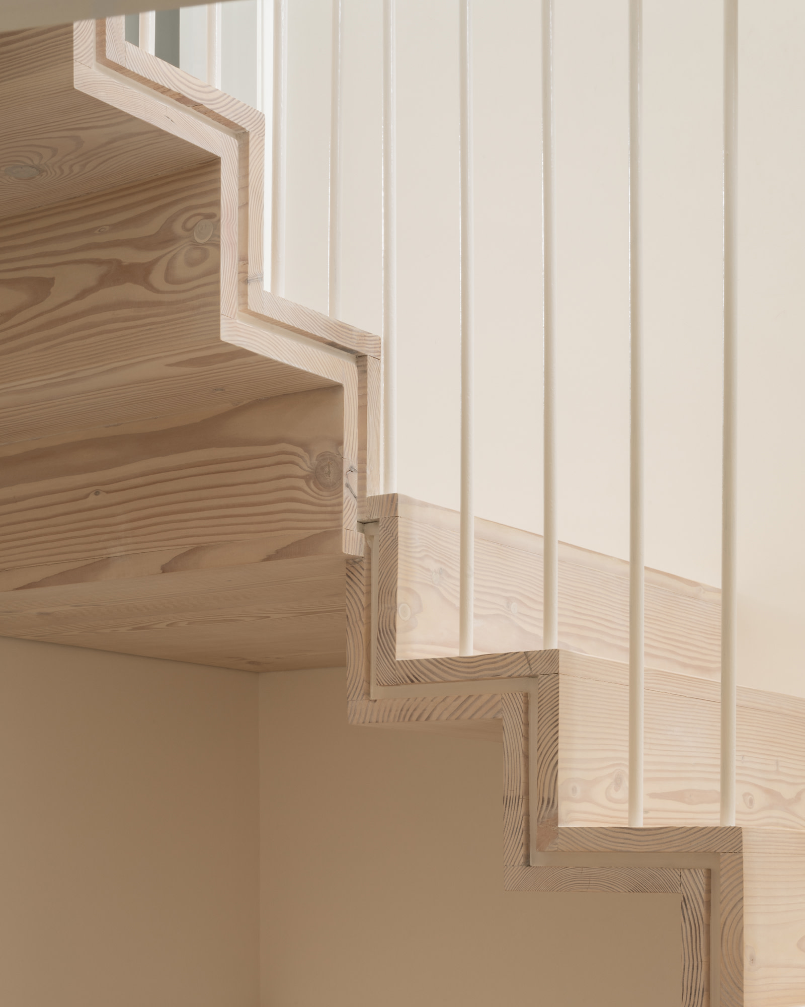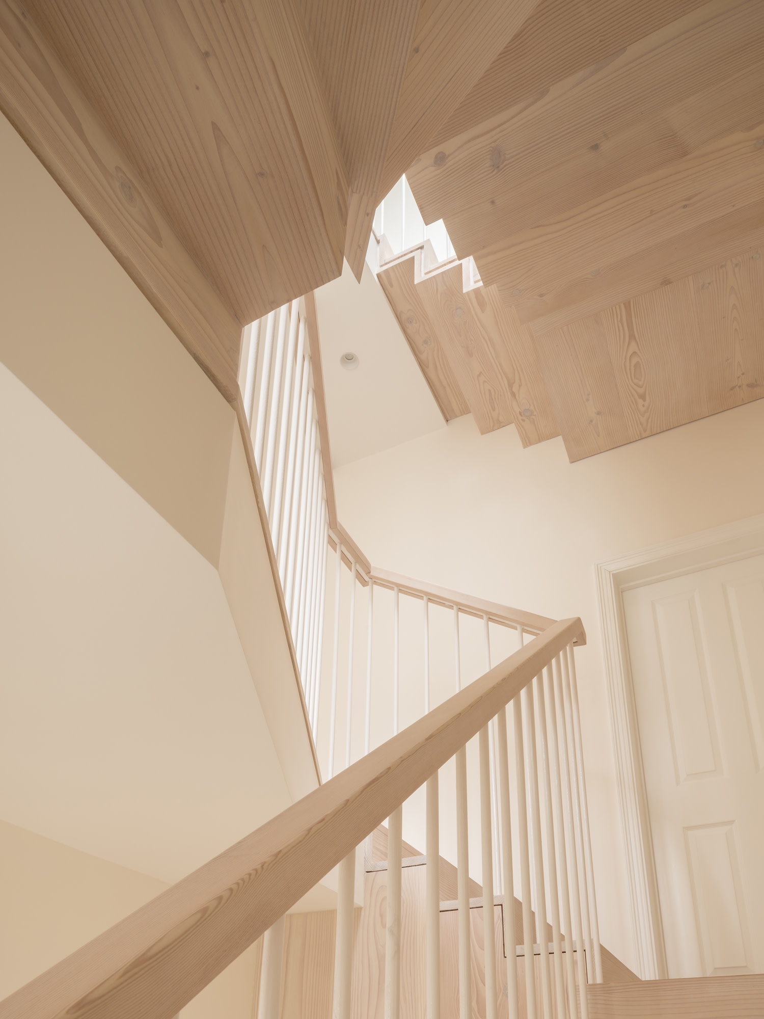 Die bestehenden Holzelemente des Hauses wurden durch neue Fußböden, eine neue Treppe und den Büroraum aus Dinesen Douglasie Natur ergänzt, um warme Kontraste zum kühlen äußeren Glasanbau zu schaffen. Die neue Holztreppe verbindet nicht nur die einzelnen Ebenen des Hauses, sondern lässt dank des architektonischen dreieckigen Hohlraums, der das Zentrum der Treppe bildet, über das Oberlicht auch natürliches Licht in jedes Stockwerk einfallen.