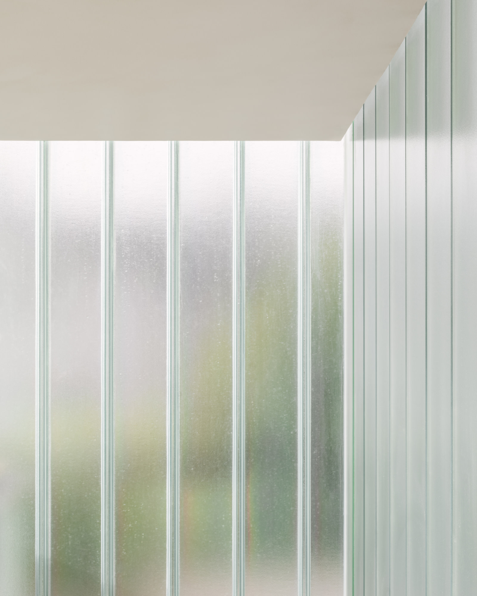 Die Wände entlang des inneren Anbaus wurden mit monolithischem Mikrozement behandelt, was dem relativ komplexen Raum einen ruhigen und gedämpften Ausdruck verleiht. Dinesen Douglasie Natur ergänzt die friedvolle Atmosphäre. Eine leichte, von Douglasienholz umhüllte Stahlkonstruktion dient als Rückzugsort zum Lesen, Arbeiten und Entspannen: ein Büro. Der Raum bietet einen angenehmen Ausblick auf den Garten und Lichteinfall durch das mattierte Glas.
