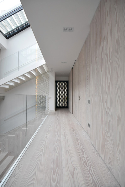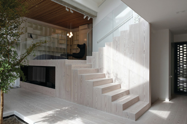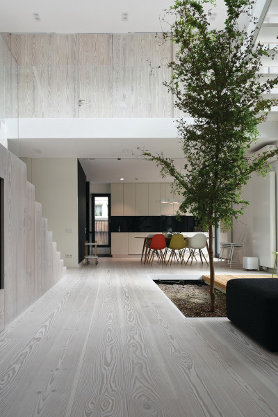 Der Stil des vierstöckigen, 386 m2 großen Hauses ist schlicht, die Einrichtung sparsam. Als wiederkehrendes, einendes Element haben die Architekten Böden, Treppen und Wandverkleidung aus Dinesen Douglasien- dielen gestaltet, die mit Lauge und weißem Öl behandelt wurden.
