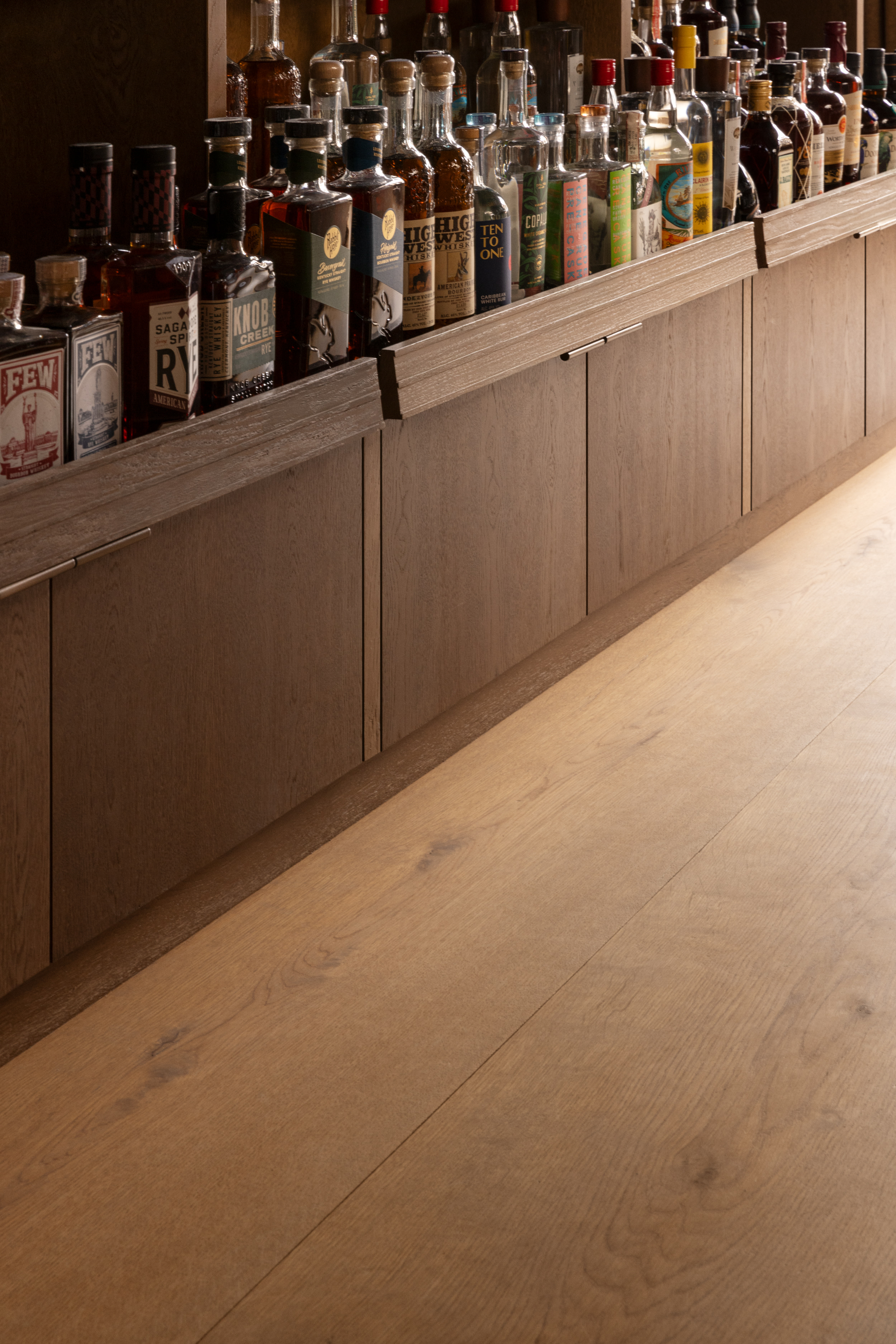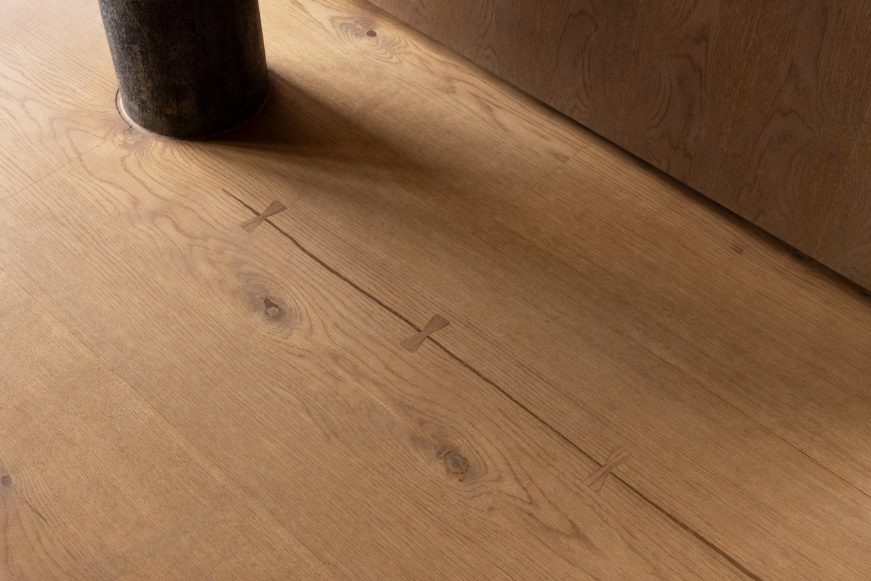 The Dinesen HeartOak flooring, with its distinctive knots and natural cracks, echoes the character and authenticity of the space, bridging past and present in a way that feels both timeless and welcoming.
