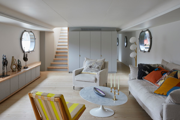 The result was this unique two-storey existential housing experience, where the water and the city's green spaces are visible from every angle. Large glazed sections on the upper floor and classic round port holes below let in natural daylight and urban life.