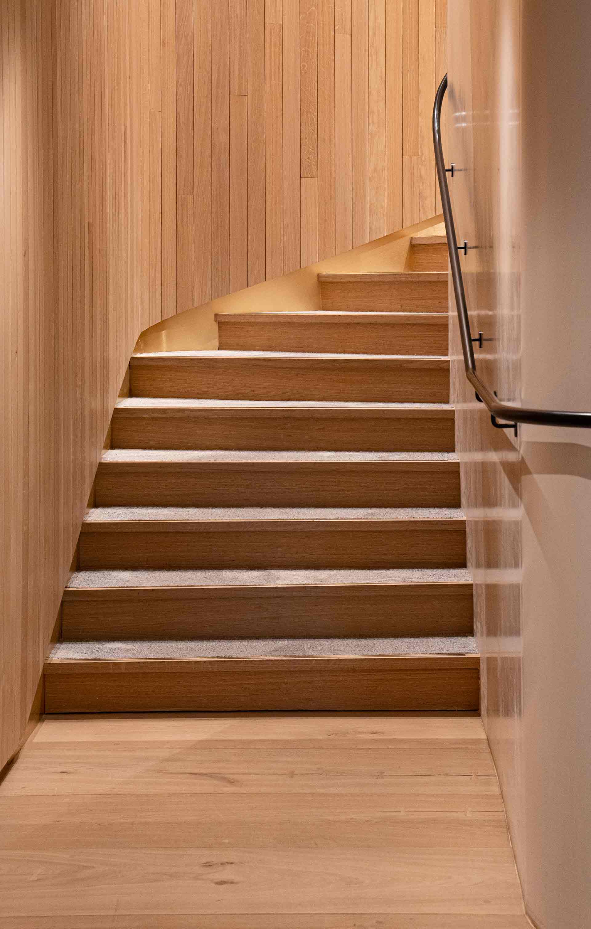 The table as well as the entire floor in this area is in Dinesen HeartOak. The long and wide oak planks continue up along the main back wall where they are used as the canvas of a quite spectacular piece of art. Each oak plank has been numerically printed with a huge scale photography so they together form a beautiful view into the natural Landes forest.