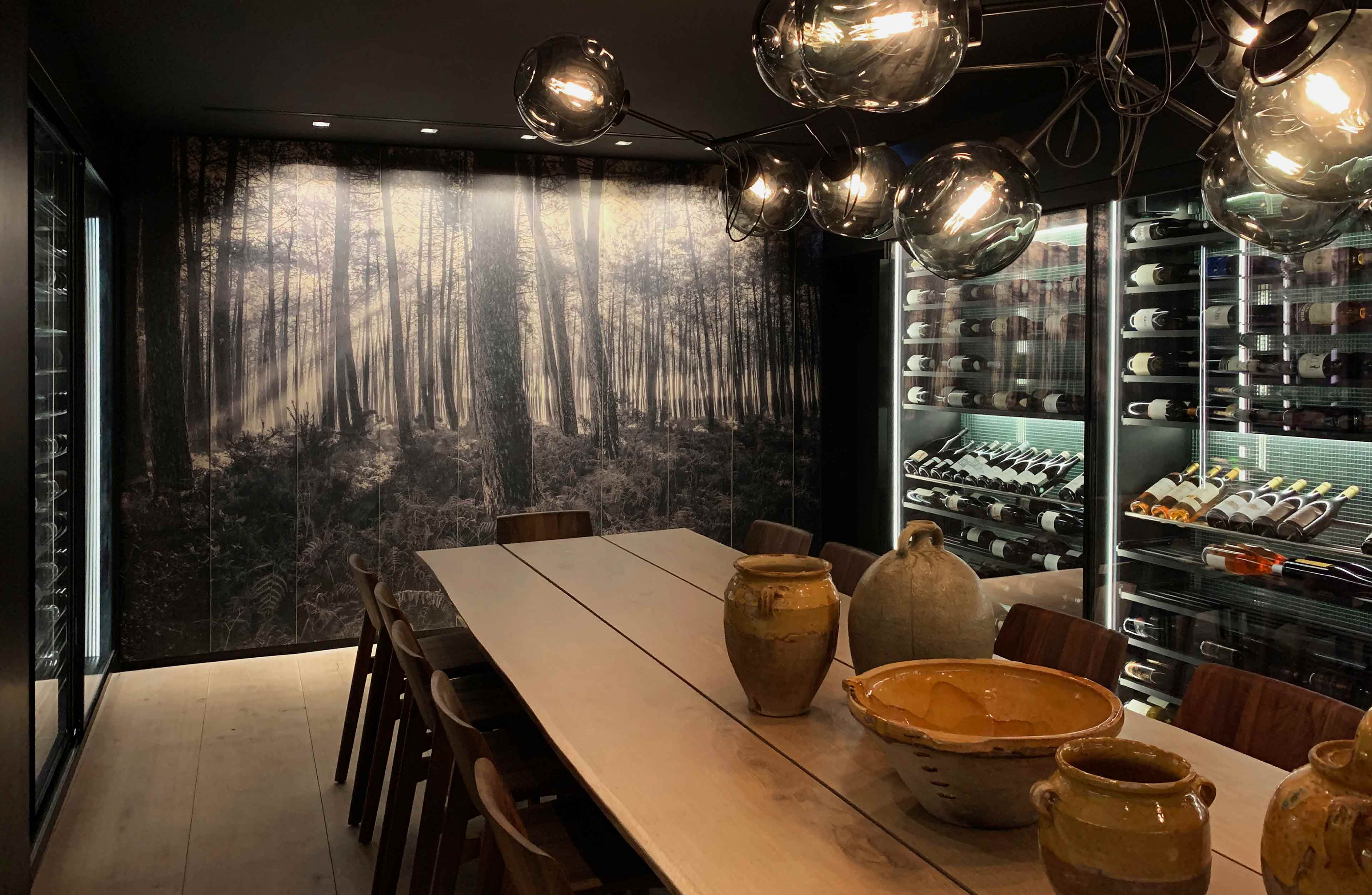 A long backlit partition wall made from armagnac colored glass tiles leads the way towards a 6 metre long table, surrounded by wine bottles, where twenty guests can sit together and enjoy a private dinner.