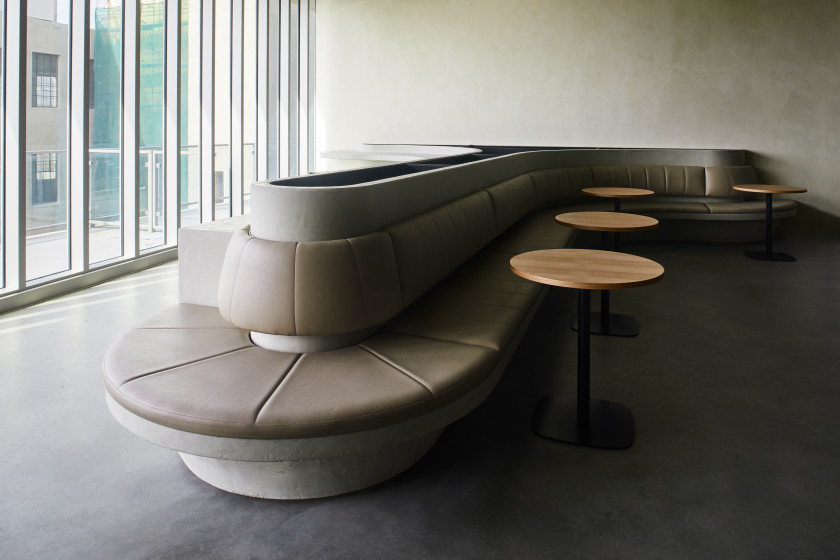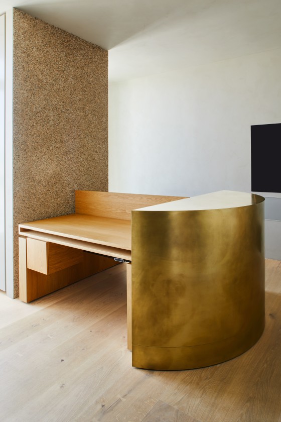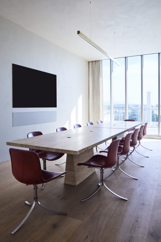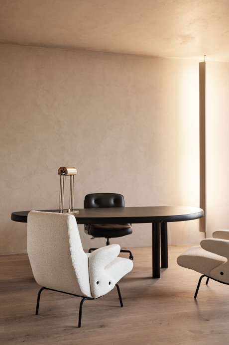 For the executive wing, where concrete floors segue to Dinesen Heart Oak, Perron boosted the level of refinement while maintaining the largely monochromatic palette and pervasive air of restrained luxury.