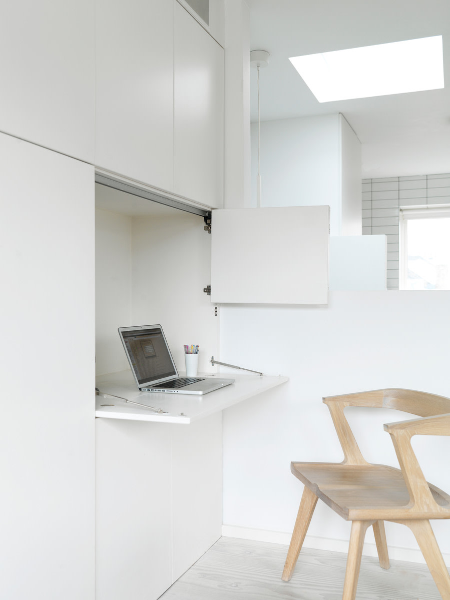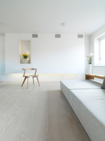 The clean expression is underscored with built-in bookcases and closets. The large closet wall in the living room contains a work space, which lets the room take on different functions throughout the day. Jeremy also designed a simple and floating panel wall with multiple functions. The wall has built-in surround sound speakers, and in combination with a projector, it acts as the family’s home cinema. On either side of the panel wall, a deep bookcase makes it possible to store the books somewhat out of sight, while the built-in lighting highlights the wooden floor. The niche for floral decorations is inspired by the Japanese interior design tradition.