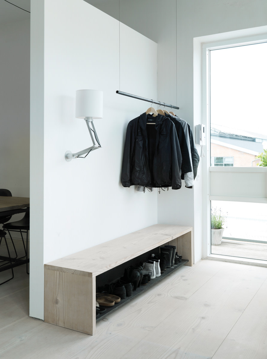 Planks from Dinesen have also been used to make a table in the children’s room and two benches. Using the same material for flooring and benches gives the narrow corridor a clean and simple expression while also meeting a functional need in a busy family.