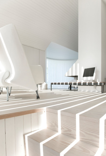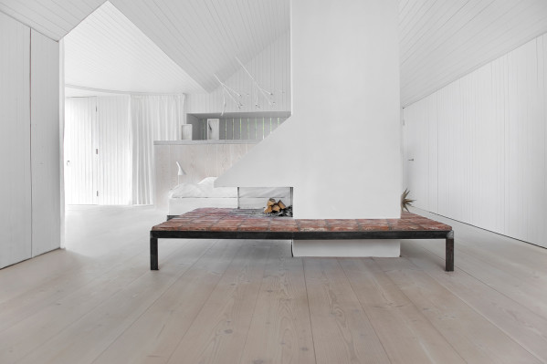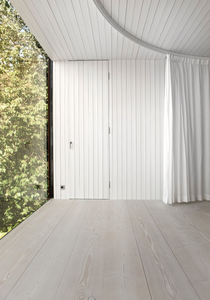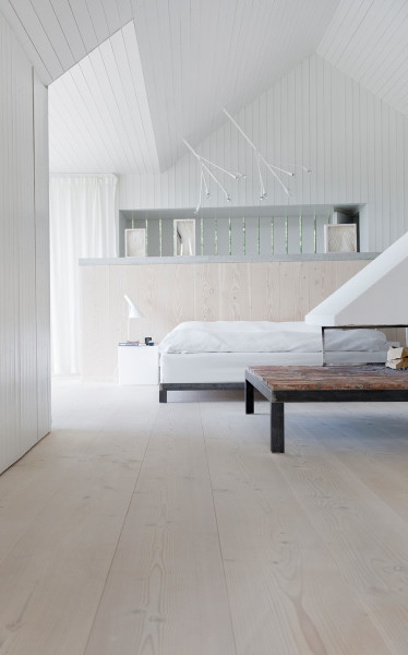 The bright and simple room serves as a combined living room and bedroom with an adjacent bathroom section behind an elegant half wall. The wall is clad with Dinesen Douglas wooden planks, which ensures a smooth transition to the Dinesen floor. For Gert and Karin Wingårdh, nature is an important source of inspiration, and they aimed to use natural materials such as stone and, not least, wood that match the old wooden house.