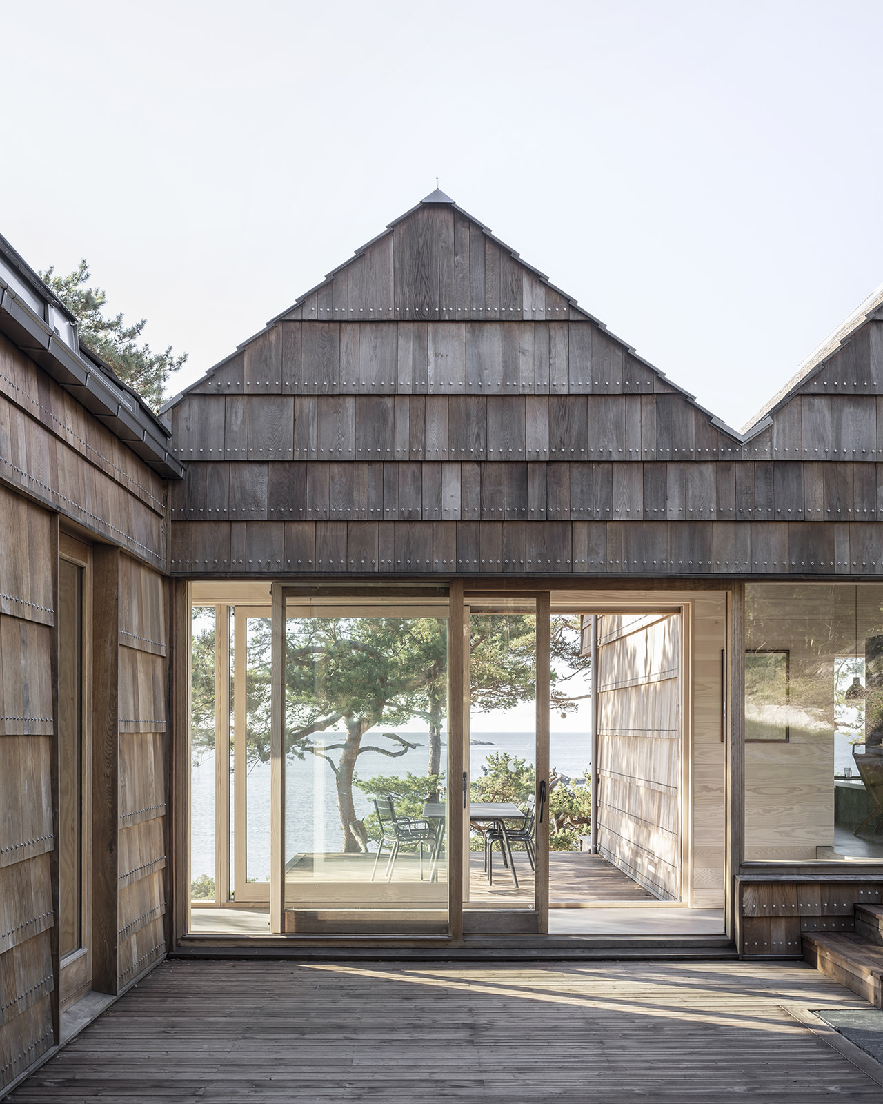 The house is built on a rocky slope in the Norwegian archipelago, situated between the sea and the forest in a rugged, rocky landscape with dense stands of fir, deciduous trees, and shrubs. With the sea on one side and the forest on the other, the Saltviga House naturally integrates into its surroundings. A thorough analysis of terrain and climate and careful processing of materials were key aspects of the process. Every single offcut was tested, processed, and prepared to withstand the sometimes harsh Norwegian weather.