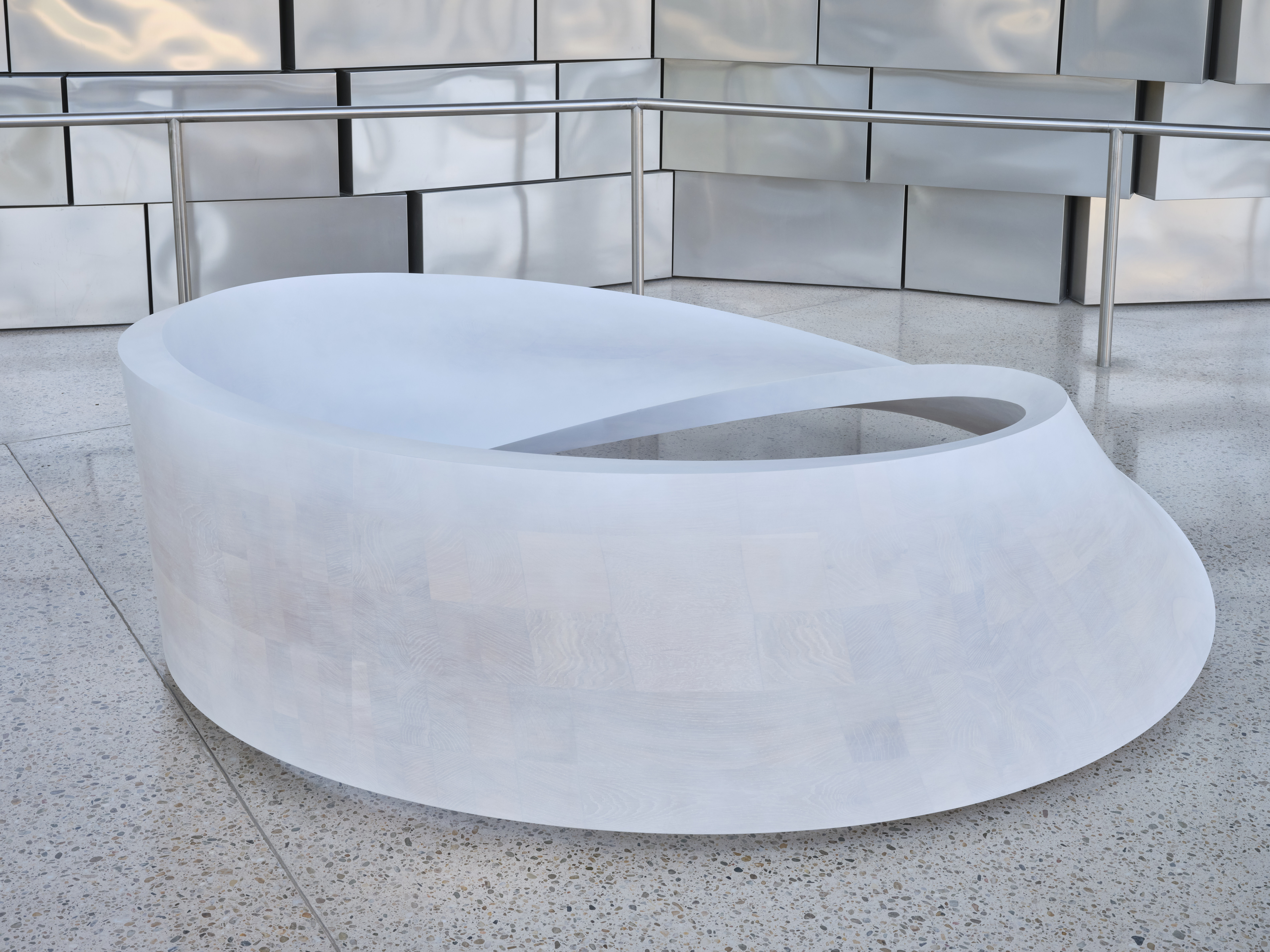 Six large Möbius sculptures crafted in solid Dinesen Oak are part of the experience. These sculptural forms, inspired by the Möbius strip’s infinite geometry, act as both spatial interventions and philosophical symbols. Each ring—a looped wooden form with a single surface and edge—represents unity, continuity, and the merging of dualities.