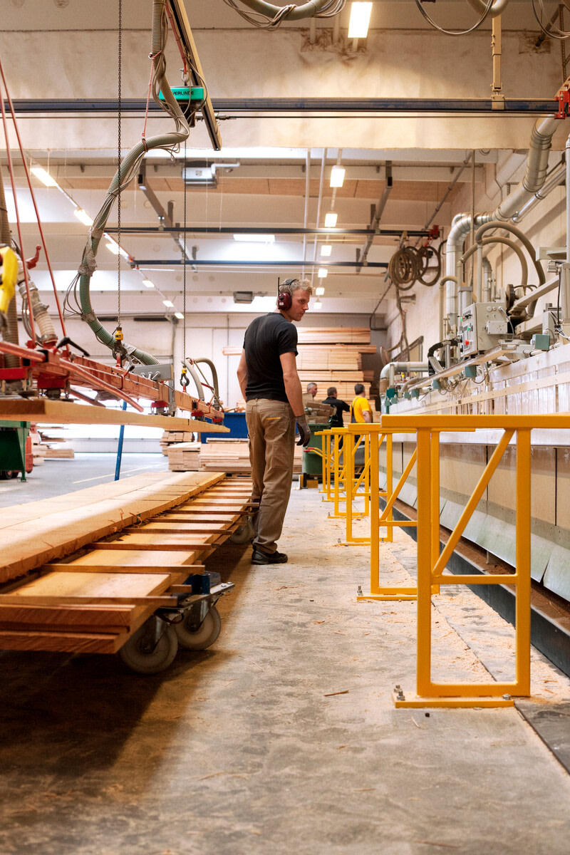 Fremstillingen er i sin helhet lang og begynner med at de store stammene skjæres til planker. Deretter stables plankene slik at luften kan sirkulere mellom lagene. Etter lufttørkingen er det tid for å ovnstørke plankene. Vi har egne tørkestuer for selv å kunne styre tørkeprosessen som er svært avgjørende for plankenes kvalitet. Av hensyn til miljøet varmer vi opp tørkestuene med biobrensel, og dessuten gjenvinner vi overskuddsvarmen. Ved sagen blir de massive plankene kantskåret omhyggelig slik at vi utnytter mest mulig av det felte treet. Heretter blir plankene høvlet i et moderne anlegg, før de sendes videre til kvalitetskontrollen.