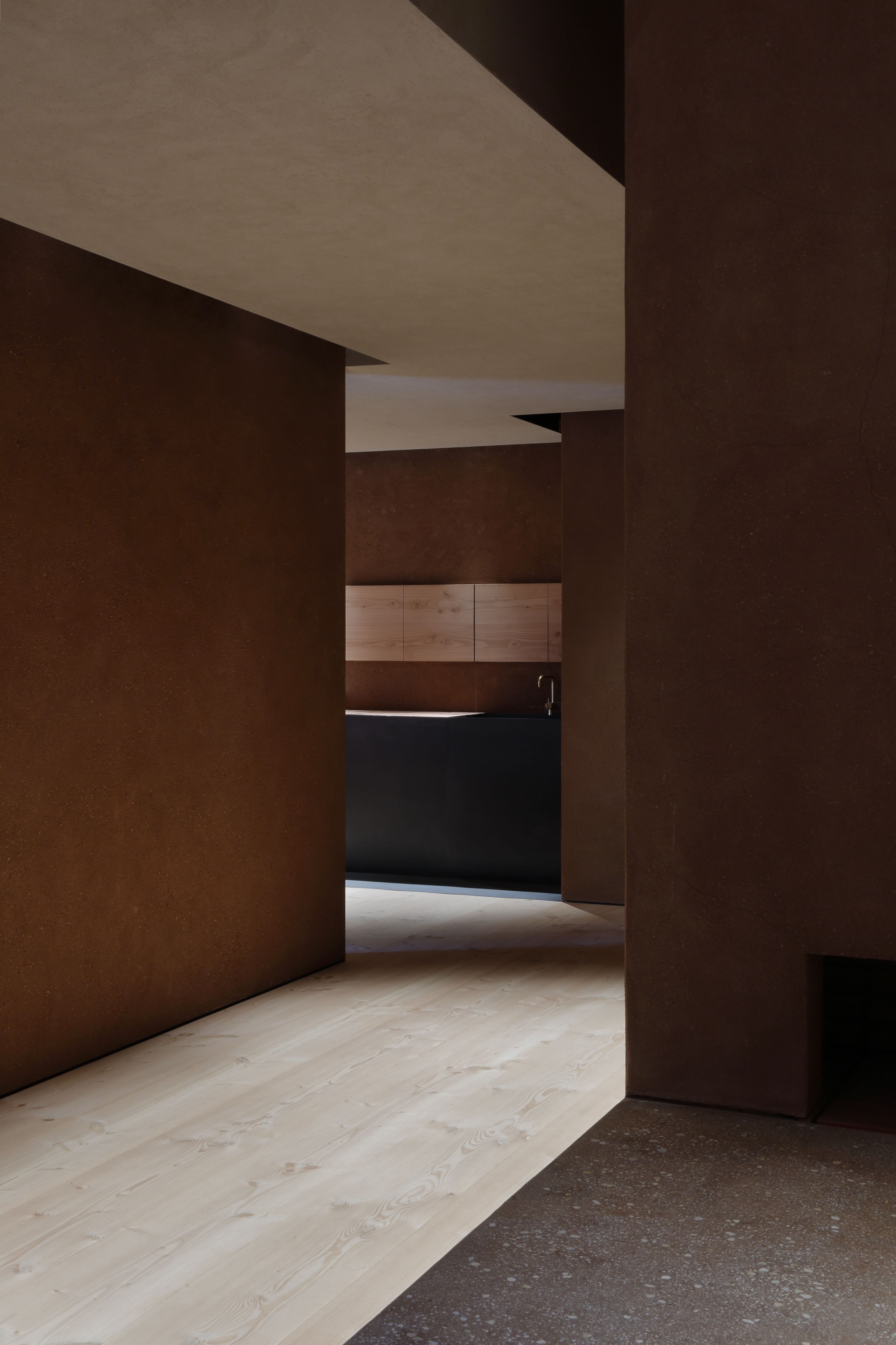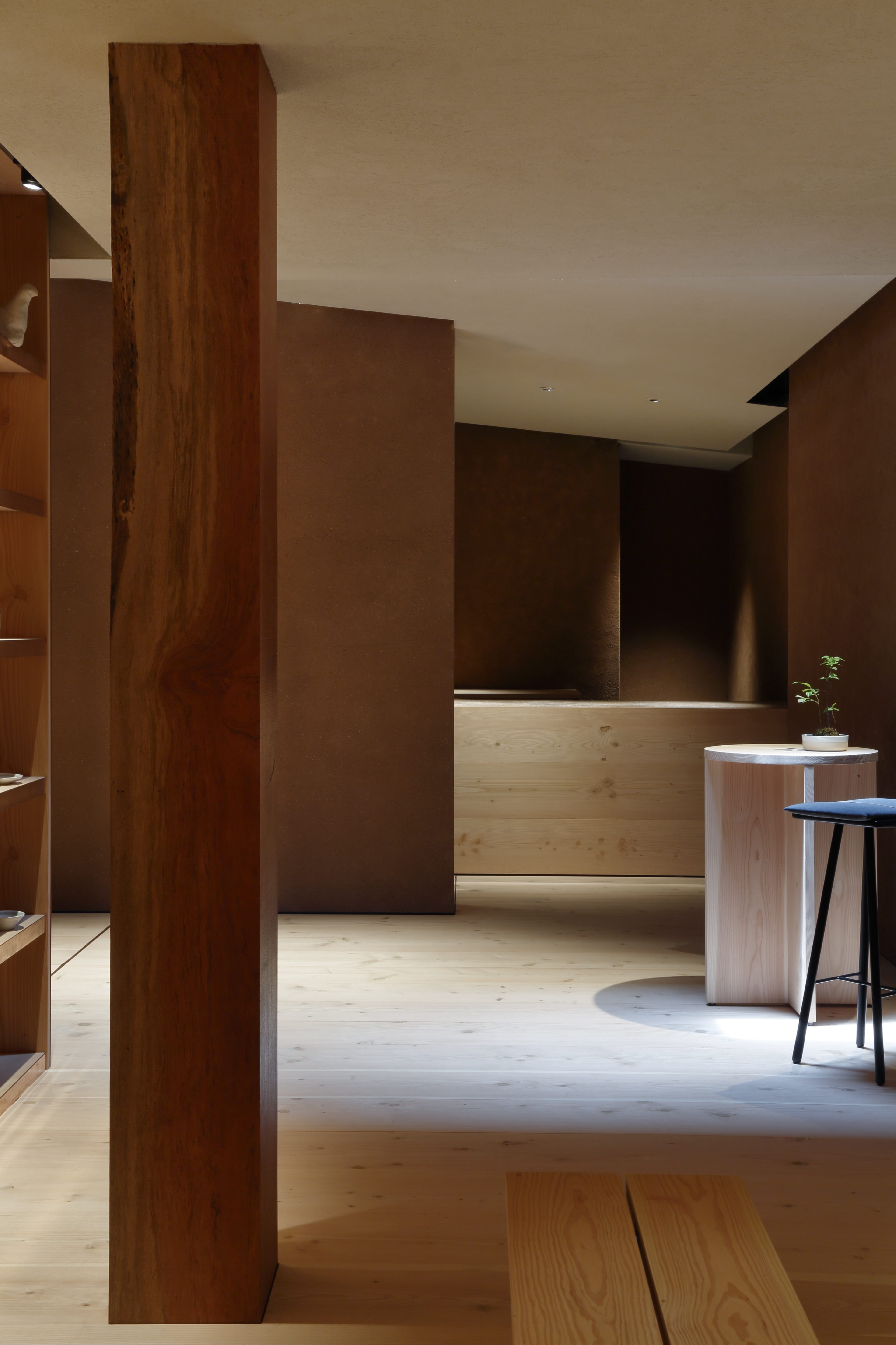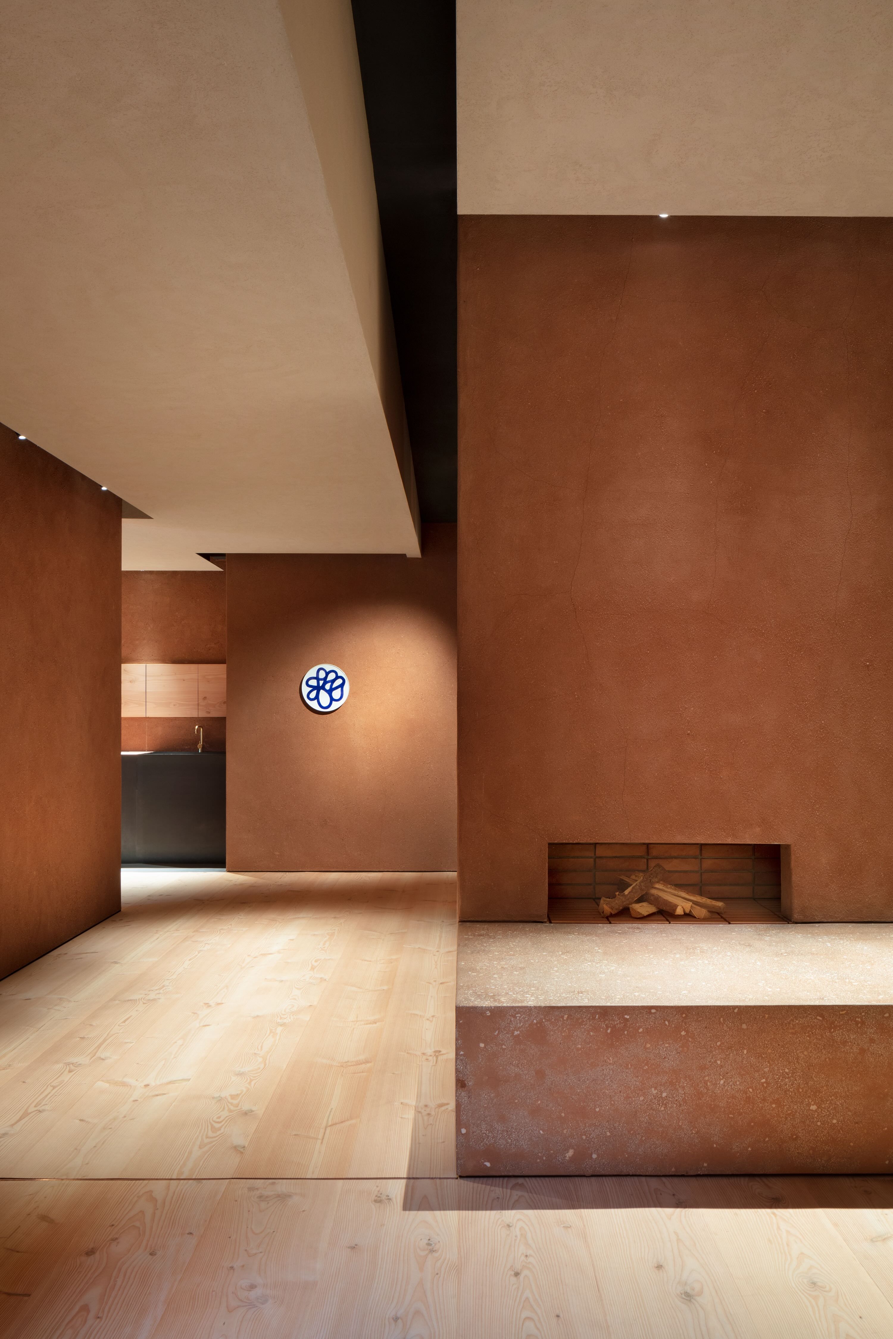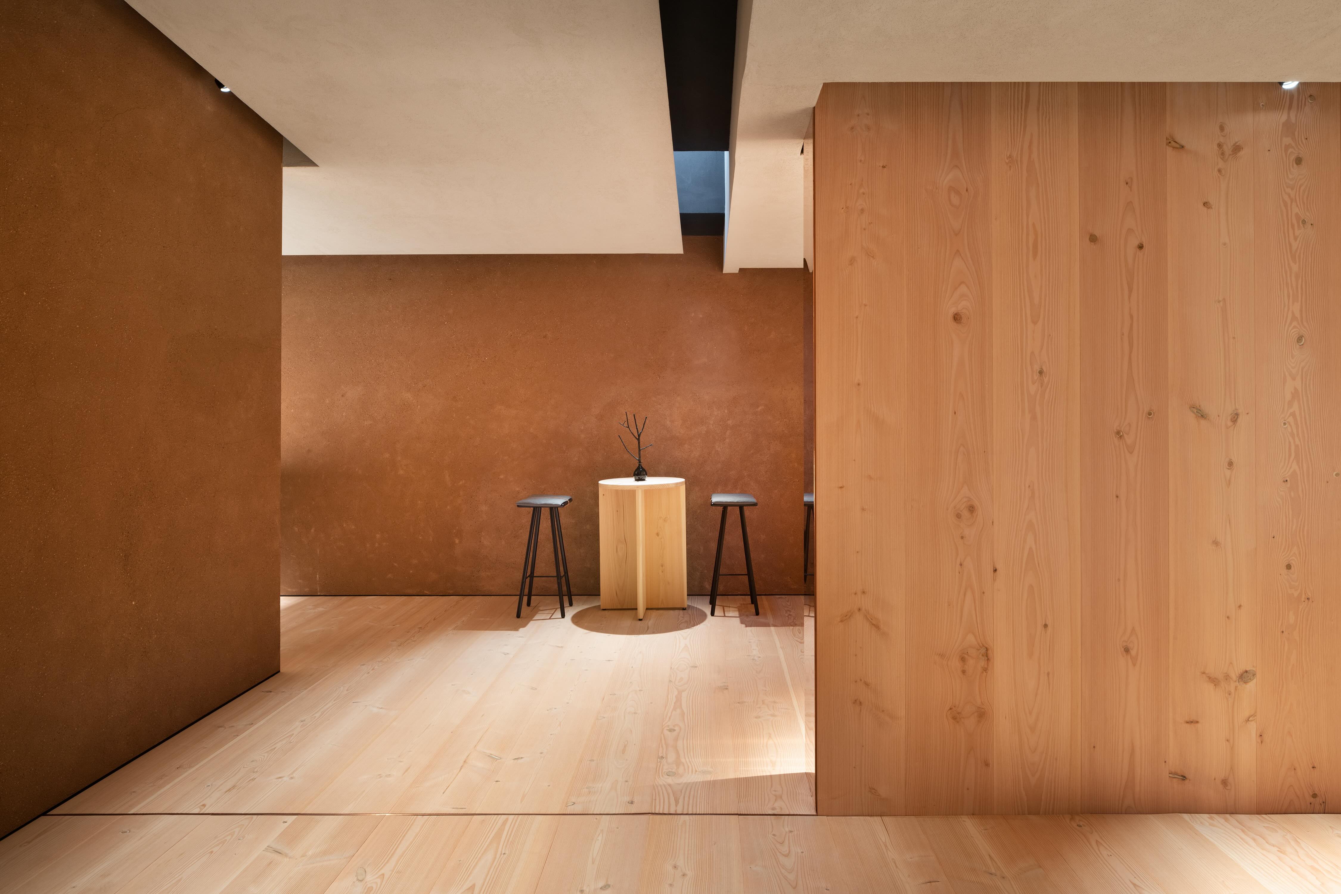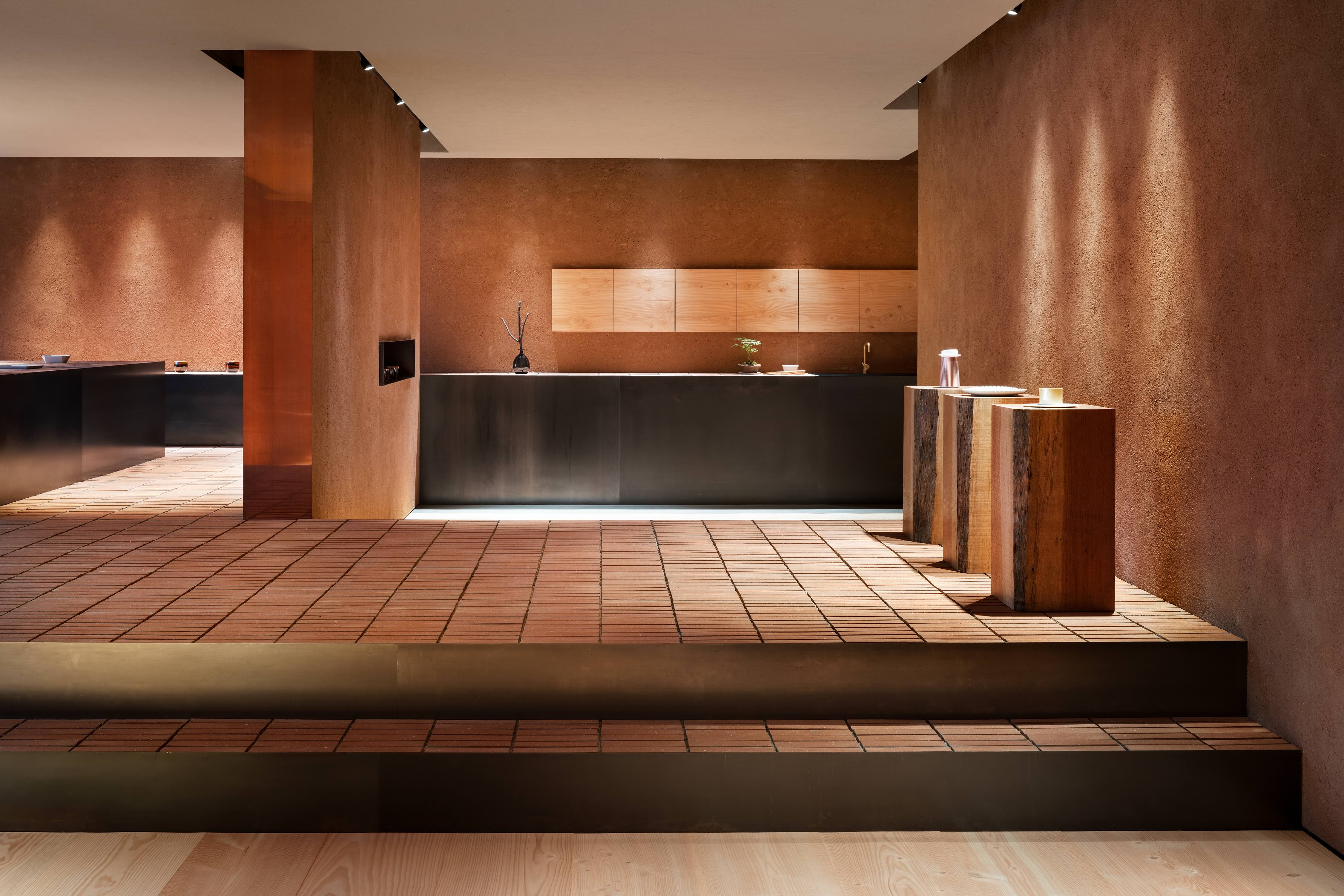 De pussede takene og veggene i keramisk stein er et materiale innleiret i Arita-porselen, som tilfører autentisitet og arv til rommet, samt en følelse av varme og ro. Utstillingsområdene er bygget opp av rødtonet murstein og gir et industrielt, men sofistikert preg til showroomet samt en forlokkende kontrast mellom materialene.