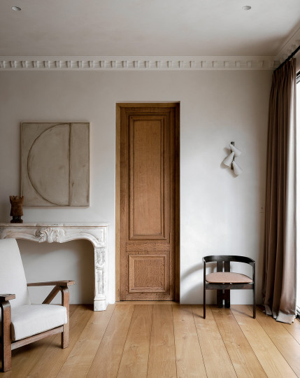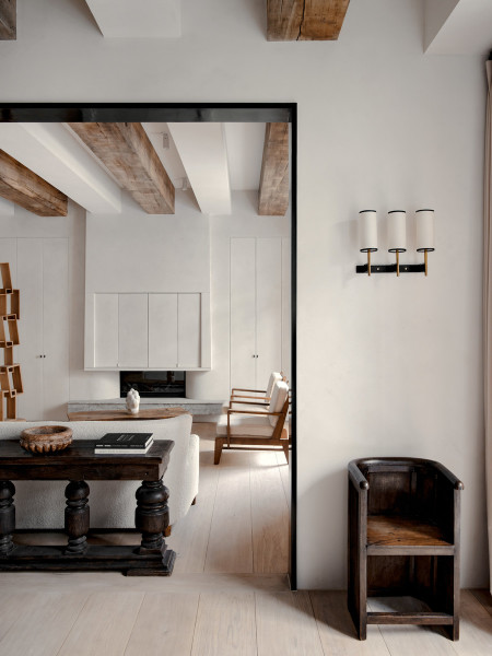 Møbler og kunst spiller opp mot det robuste, nesten uferdige skall, de frittlagte trebjelkene, ru gipsvegger og Dinesen-eikegulv som tilføyer en ekstra varme til rommet. Leilighetens interiør fungerer som en skarp kontrast mot bybildet, hvilket skaper en estetikk som transporterer beboerne til et rustikt landlig retreat. Dinesen eiketregulv går igjen i den 220 kvm store leiligheten hvor gulvene tilfører en atmosfærisk varme til rommene og bringer naturens sanselige kvaliteter inn i hjemmet.
