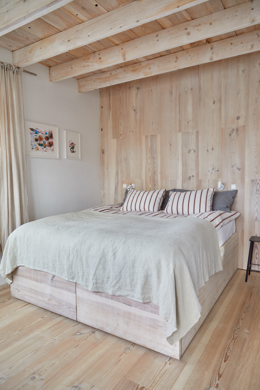 Interiørets beskjedne 16 m2 åpner til en ren hjemlig atmosfære, med en avdempet fargepalett og materialer som messing og tre. Gulvet er lagt med gjenbrukt tre i Dinesen Douglas fra Genbyg. Douglastreet er benyttet til en spesialdesignet benk, sengeramme og en dedikert vegg hvor de naturlige kvistene står i flott kontrast til de hvite omgivelser og vinduer med sprosser.