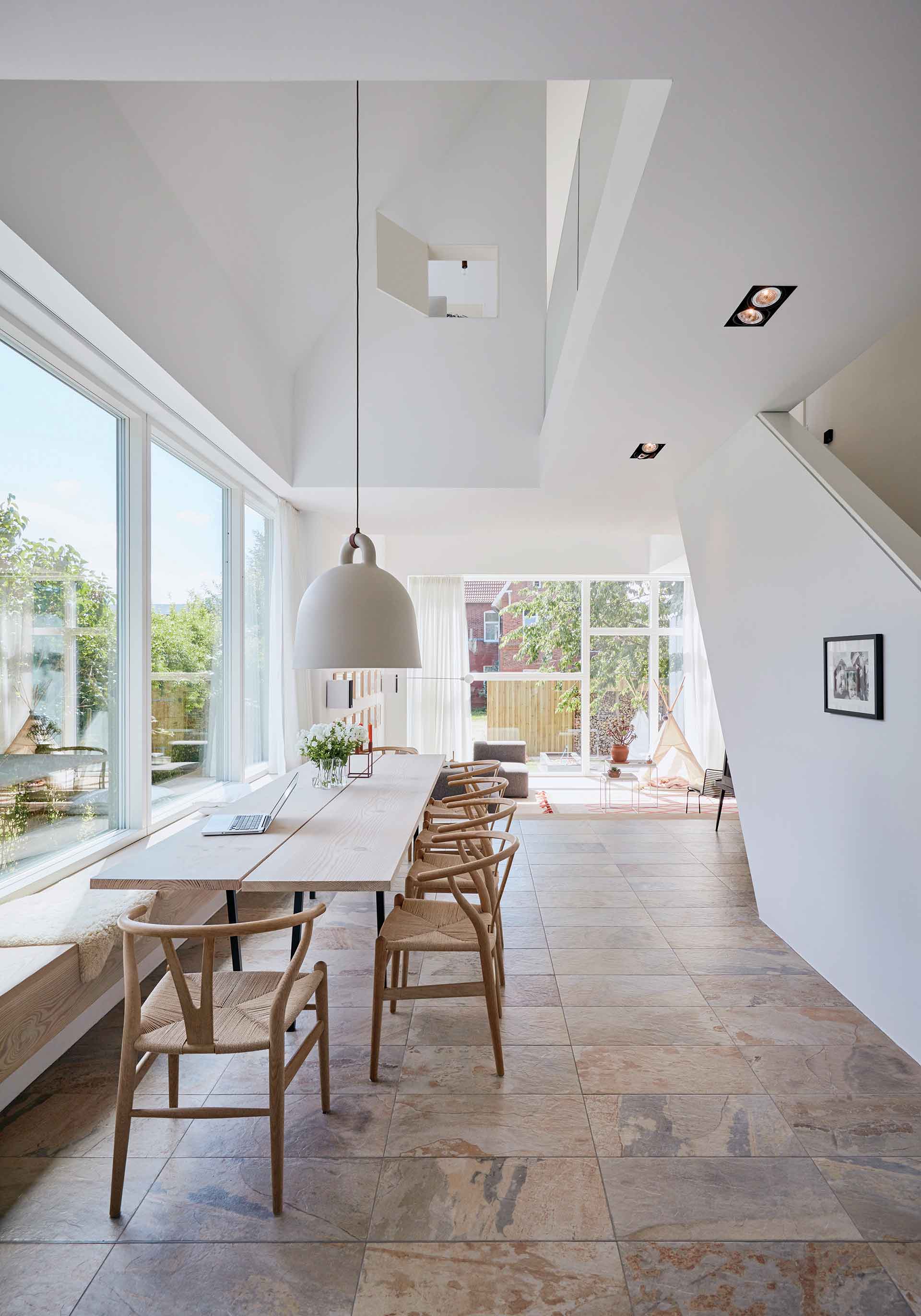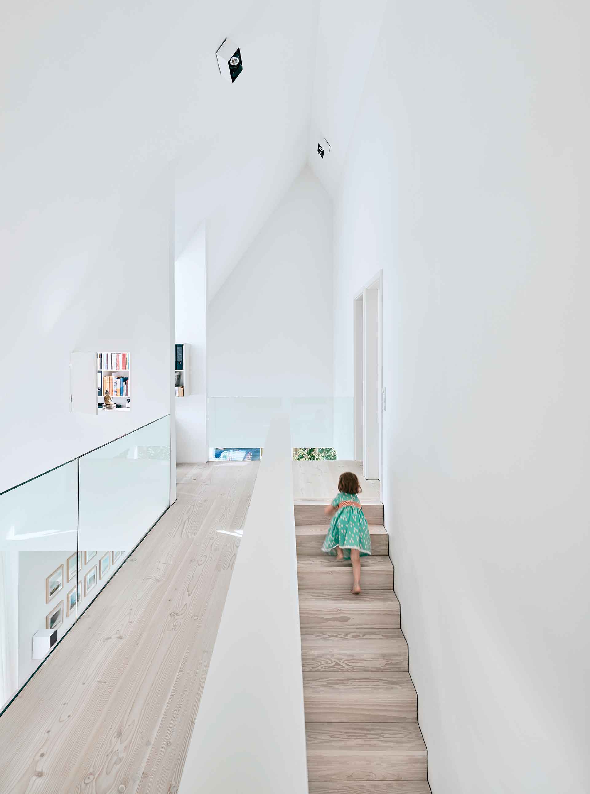 In the drawing process, the couple tried working with various shapes, but kept coming back to the archetypal house shape but with a modern twist. The building appears self-confident while simultaneously blending into the historical and classic neighbourhood. The building has classic materials that are common to the area such as veneer stone. It has an open roof truss, which makes the rooms very light.
